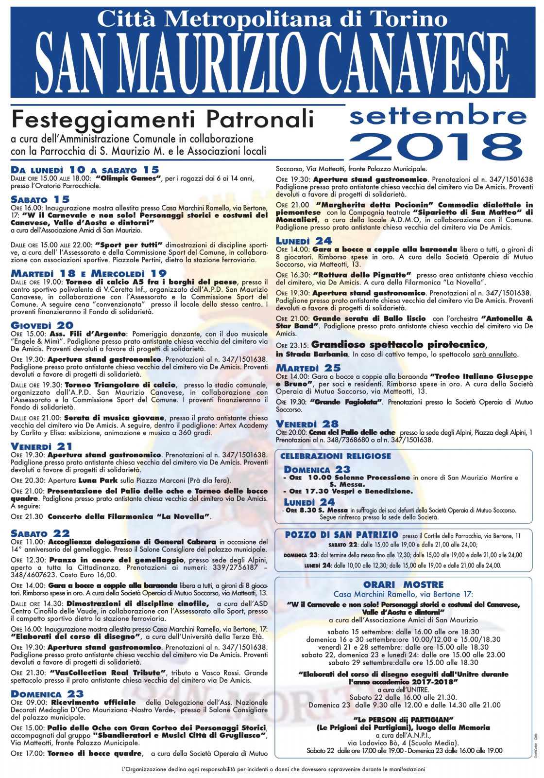 E' pronto il programma della Festa Patronale 2018, organizzata dall'Amministrazione comunale in collaborazione con la parrocchia di San Maurizio Martire e le associazioni del paese.