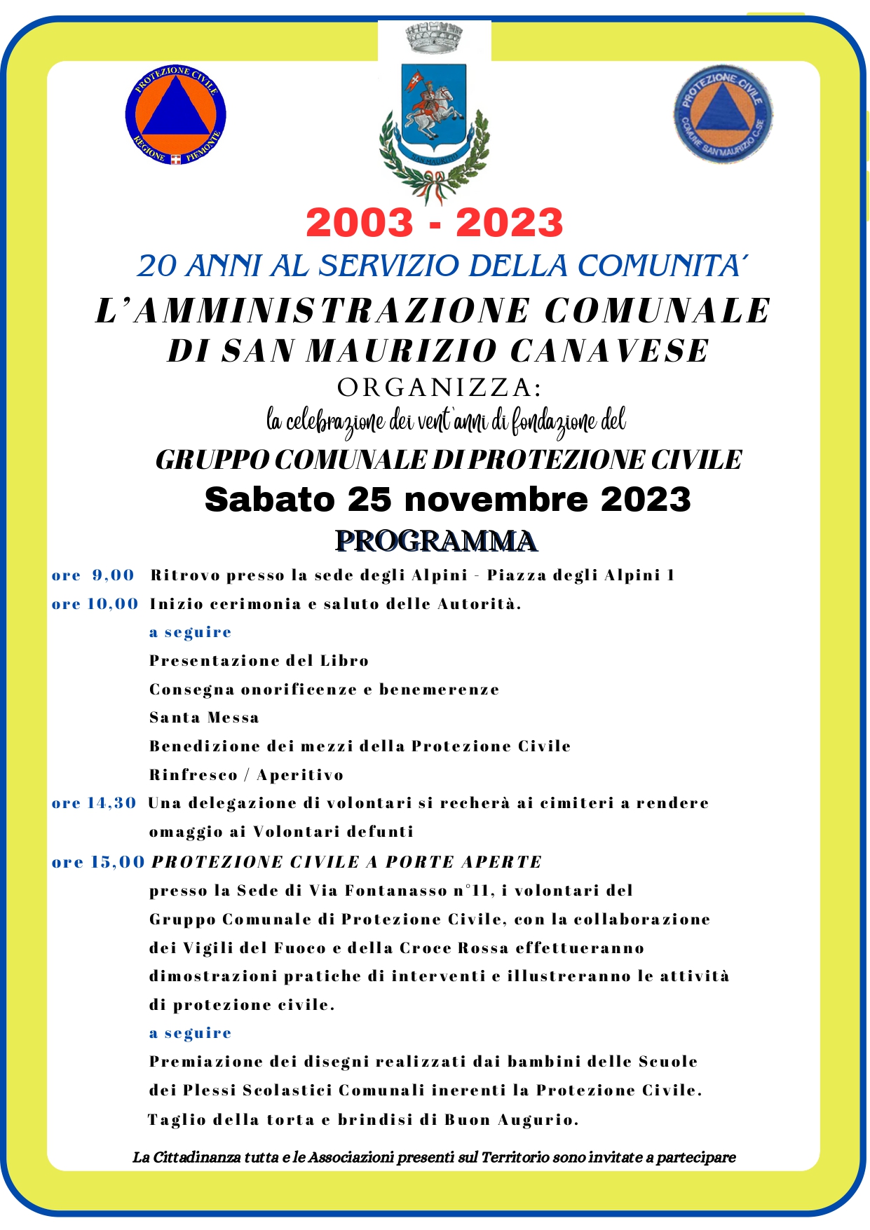 La nostra Protezione civile compie 20 anni. Sarà un giorno di festa a San Maurizio Canavese, sabato 25 novembre, in occasione del ventesimo anniversario del Gruppo comunale di Protezione civile. In onore di tutte le volontarie e di tutti i volontari che hanno prestato e prestano servizio per il bene della nostra comunità, l'Amministrazione comunale ha organizzato una manifestazione alla quale naturalmente è invitata tutta la popolazione. L'appuntamento sarà alle ore 9 con il ritrovo presso la sede del Gruppo Alpini, in piazza degli Alpini 1. Alle 10 incomincerà la cerimonia, con il saluto delle autorità, la presentazione del libro realizzato per celebrare i 20 anni della Protezione Civile a San Maurizio Canavese, la consegna di onorificenze e benemerenze, la messa, la benedizione dei mezzi della Protezione civile. Seguirà un rinfresco. Nel pomeriggio, alle 14.30, una delegazione si recherà al cimitero per rendere omaggio ai volontari defunti. Poi, a partire dalle 15, "Protezione civile a porte aperte" presso la sede di via Fontanasso 11. I volontari del Gruppo comunale di Protezione civile, con la collaborazione dei Vigili del Fuoco e della Croce Rossa Italiana effettueranno dimostrazioni pratiche di interventi e illustreranno le attività di protezione civile. Seguiranno la premiazione dei disegni dei bambini delle scuole, il taglio della torta e il brindisi finale.