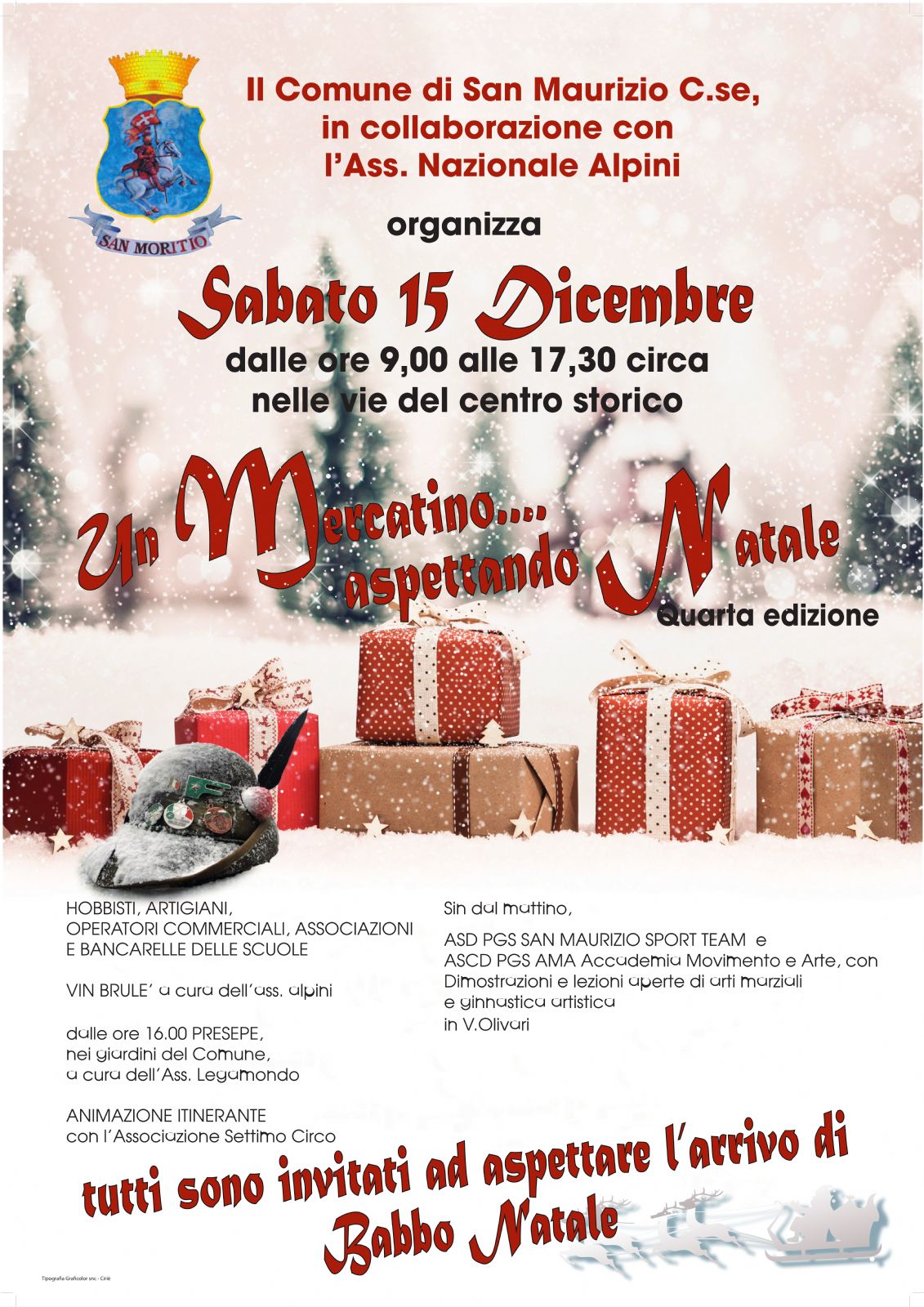 L'appuntamento è sabato 15 dicembre. Dalle 9 alle 17,30, le vie del centro storico ospiteranno bancarelle di hobbisti, artigiani, associazioni, operatori commerciali e bancarelle delle scuole. Non mancherà, naturalmente, il mitico vin bruIé degli Alpini, mentre l'animazione itinerante sarà a cura dell'associazione Settimo Circo. Dalle 16, nei giardini del municipio, ci sarà anche il presepe dell'associazione Legamondo. Fin dal mattino, inoltre, in via Olivari l'associazione PGS San Maurizio Sport Team e PGS AMA Accademia Movimento e Arte offriranno dimostrazioni e lezioni aperte di arti marziali e ginnastica artistica.
