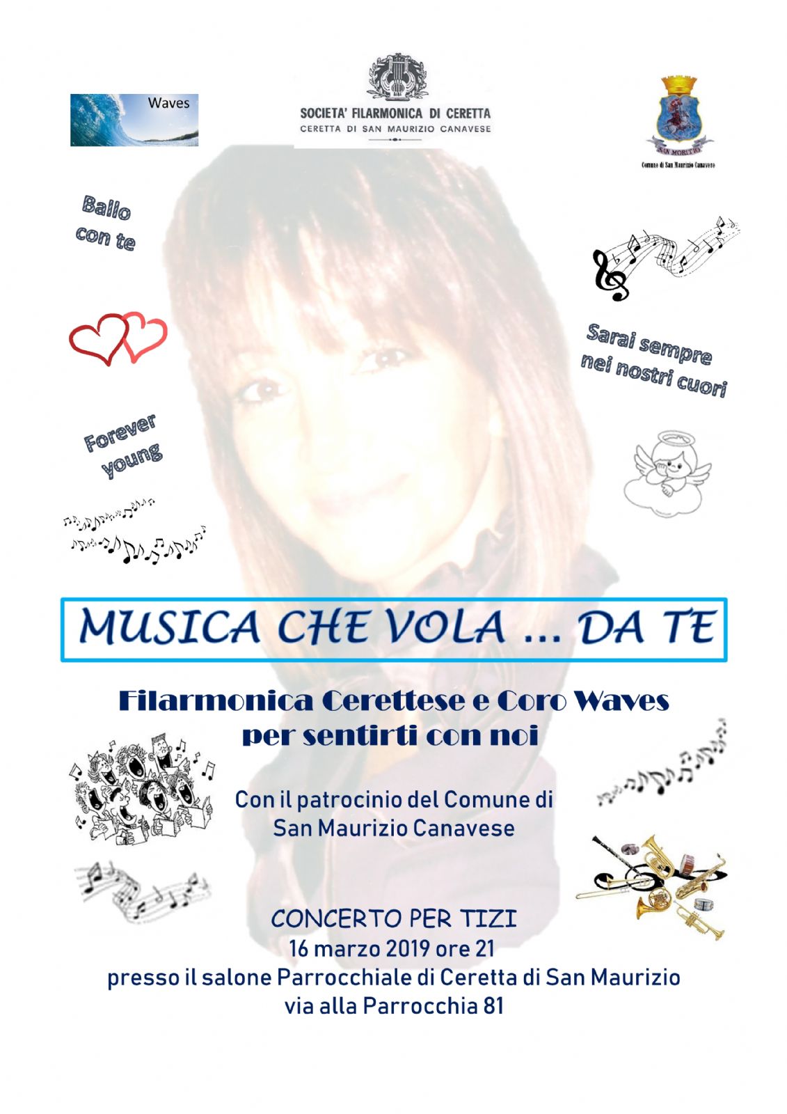 Il dolore per chi non c'è più, ma soprattutto la delicata gioia di unirsi a lei attraverso la musica e l'armonia. Sabato 16 marzo, alle ore 21 nel salone parrocchiale di Ceretta, la Filarmonica Cerettese e il Coro Waves, con il patrocinio del Comune di San Maurizio Canavese organizzano “Musica che vola da te. Concerto per Tizi”.