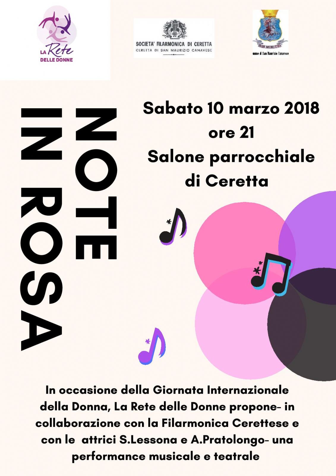 Gli eventi orgnizzati in paese in occasione della Giornata Internazionale della Donna si arricchiscono di un nuovo interessante appuntamento. La Rete delle Donne - in collaborazione con la Filarmonca Cerettese, le attrici S. Lessona e A. Pratolungo e con il patrocinio del Comune di San Maurizio Canavese - propone "Note in rosa", una serata di musica e teatro.