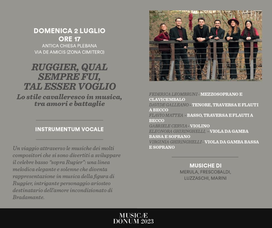 Domenica 2 luglio, ore 17, Antica Chiesa Plebana: Ruggier, qual sempre fui, tal esser voglio. Lo stile cavalleresco in musica, tra amori e battaglie, con il sestetto "Instrumentum Vocale". Musiche di Merula, Frescobaldi, Luzzaschi, Marini.