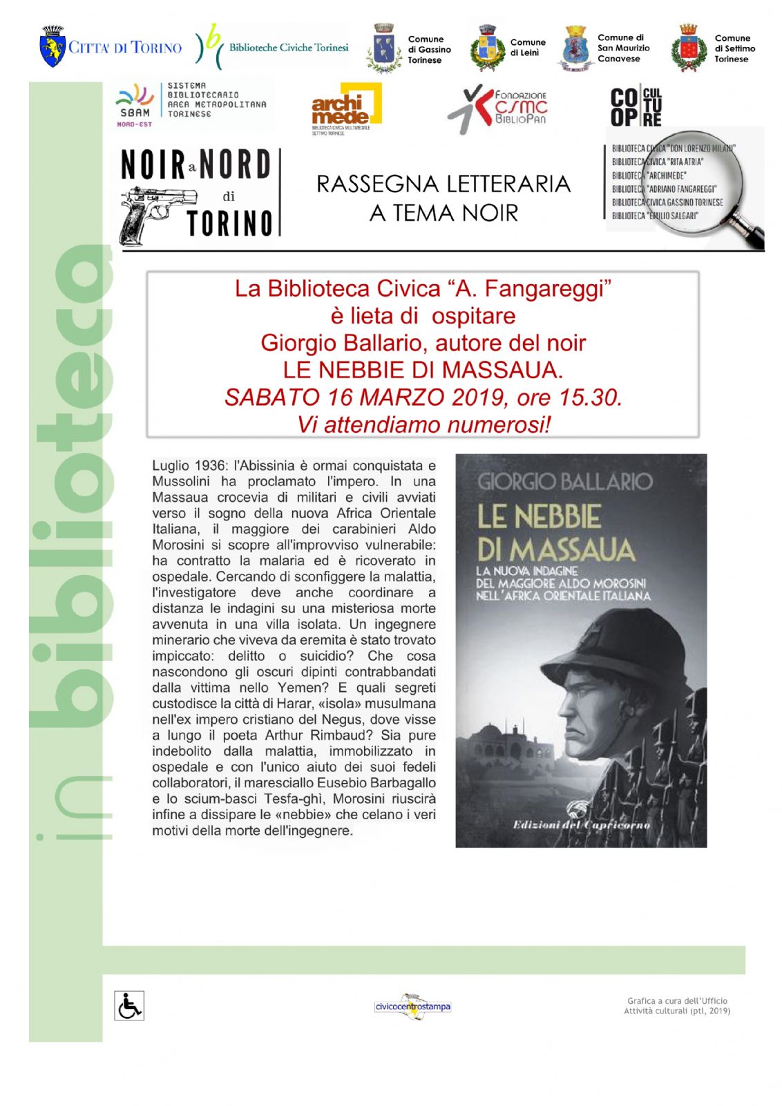 Sabato 16 marzo, alle ore 15.30, la Biblioteca Civica “Adriano Fangareggi” di San Maurizio Canavese (via Carlo Alberto, 21) in collaborazione con la Casa Editrice “Edizioni del Capricorno” di Torino, ospiterà Giorgio Ballario, autore del Noir “Le nebbie di Massaua”.