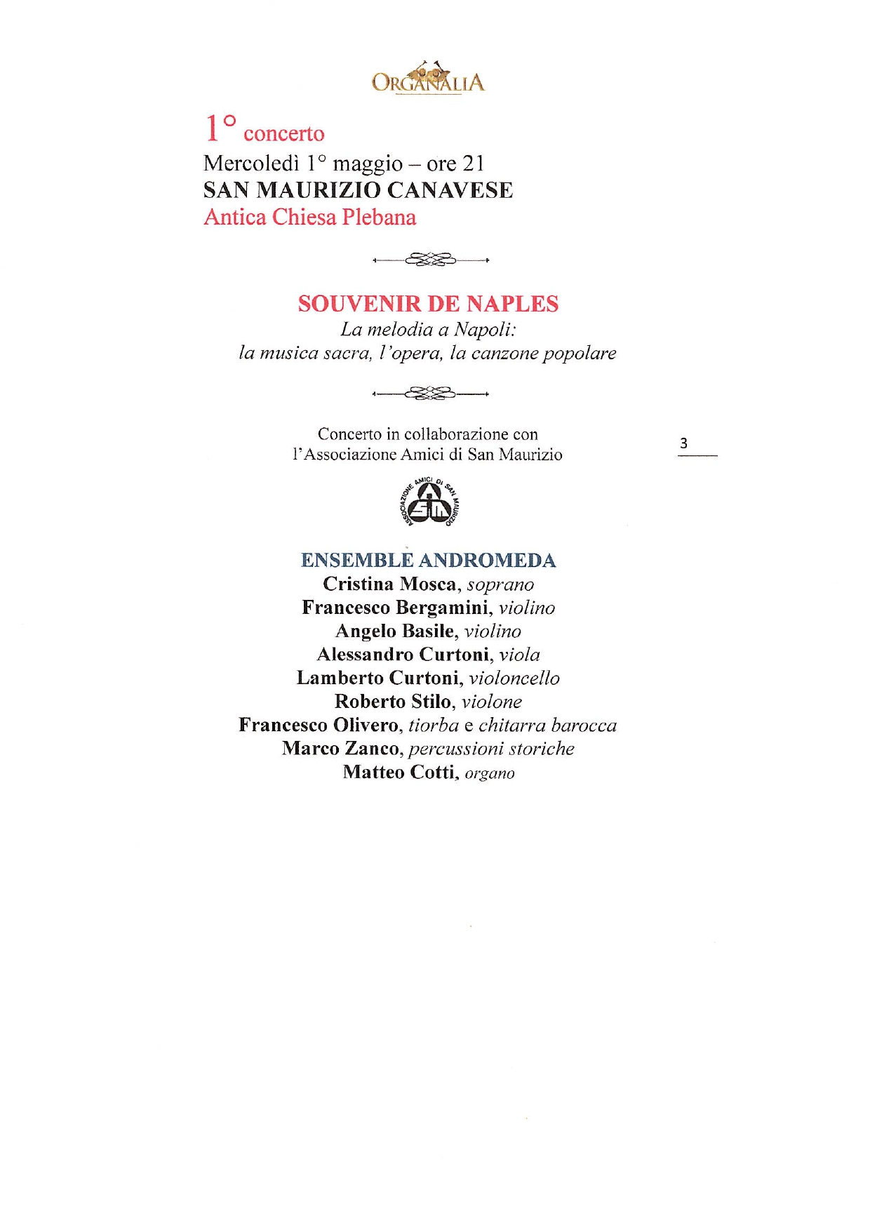 Organalia, l'ormai celebre rassegna concertistica per la promozione della musica organistica e strumentale sul territorio, farà tappa a San Maurizio Canavese con un primo concerto mercoledì 1° maggio. L'appuntamento è nell'Antica Chiesa Plebana alle ore 21 con "Souvenir de Naples - La melodia a Napoli: la musica sacra, l'opera, la canzone popolare" dell'Ensemble Andromeda. Saranno proposte musiche di Carlo Gesualdo, Alessandro Scarlatti, Nicolò Fiorenza, Leonardo Leo.