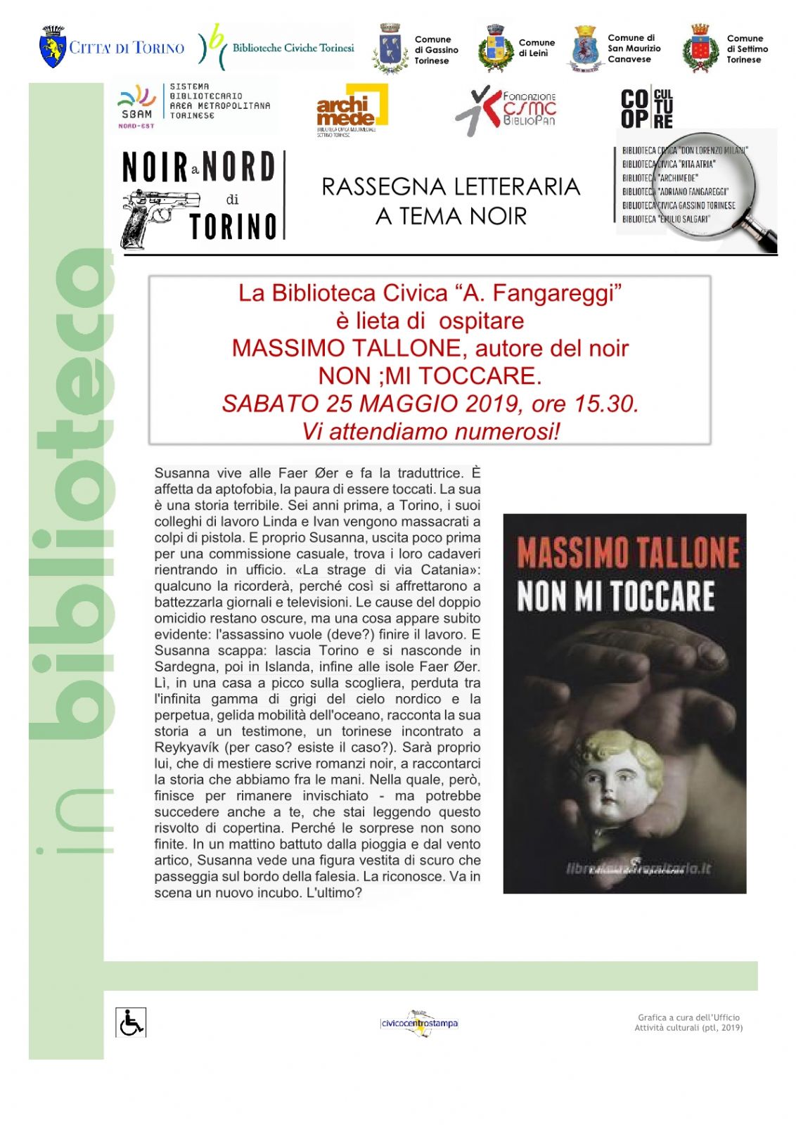 Sabato 25 maggio, alle ore 15.30, la Biblioteca Civica “Adriano Fangareggi” di San Maurizio Canavese (via Carlo Alberto, 21) in collaborazione con la Casa Editrice “Edizioni del Capricorno” di Torino, ospiterà Massimo Tallone, autore del Noir “Non mi toccare”, appena presentato all'ultimo Salone Internazionale del Libro di Torino.