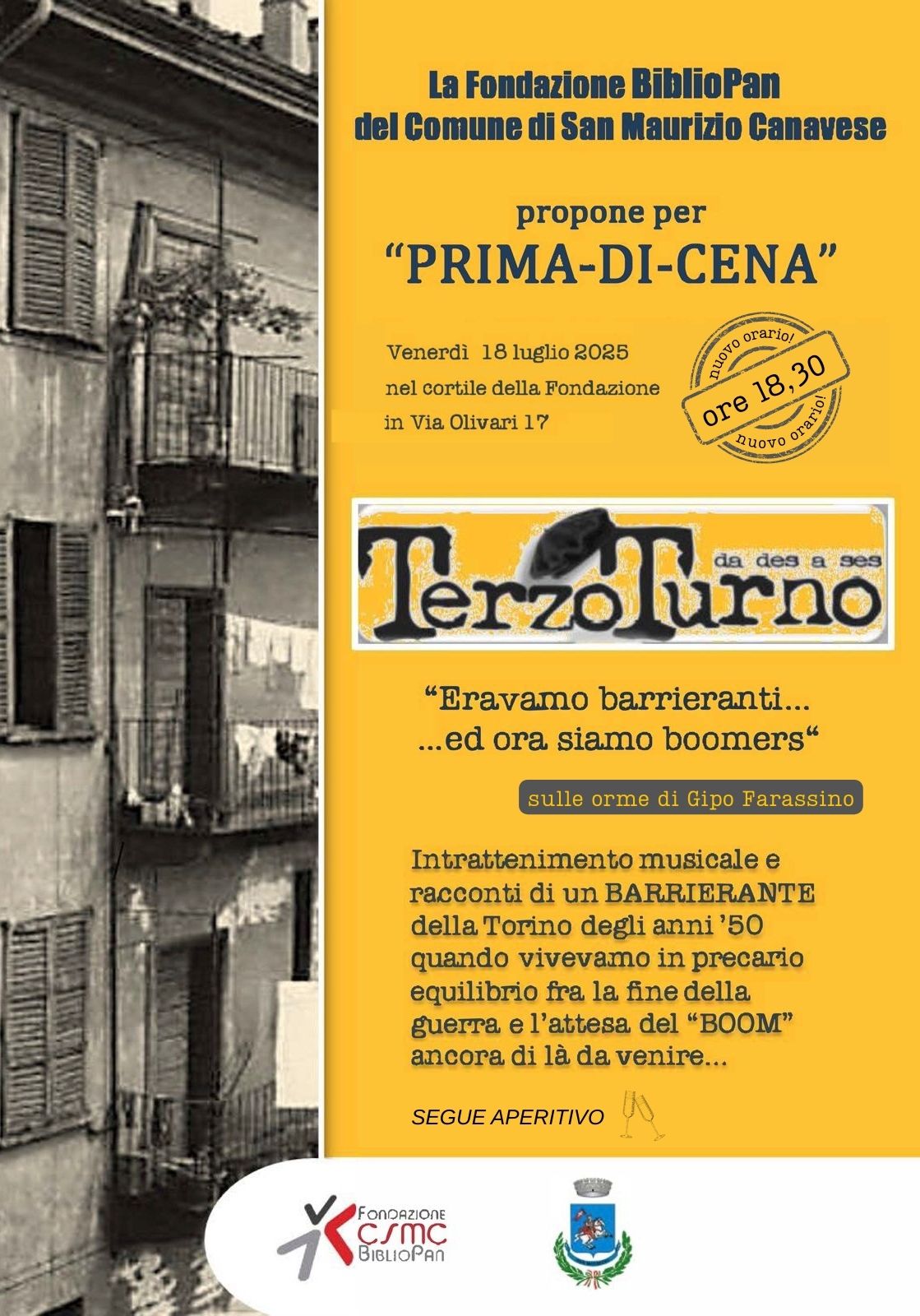 Venerdì 18 luglio alle ore 18,30 nel cortile della Fondazione (in via Olivari 17) i "Terzo Turno" ci accoglieranno con “Eravamo barrieranti e ora siamo boomers”, intrattenimento musicale e racconti di un barrierante della Torino degli Anni Cinquanta sulle note di Gipo Farassino.