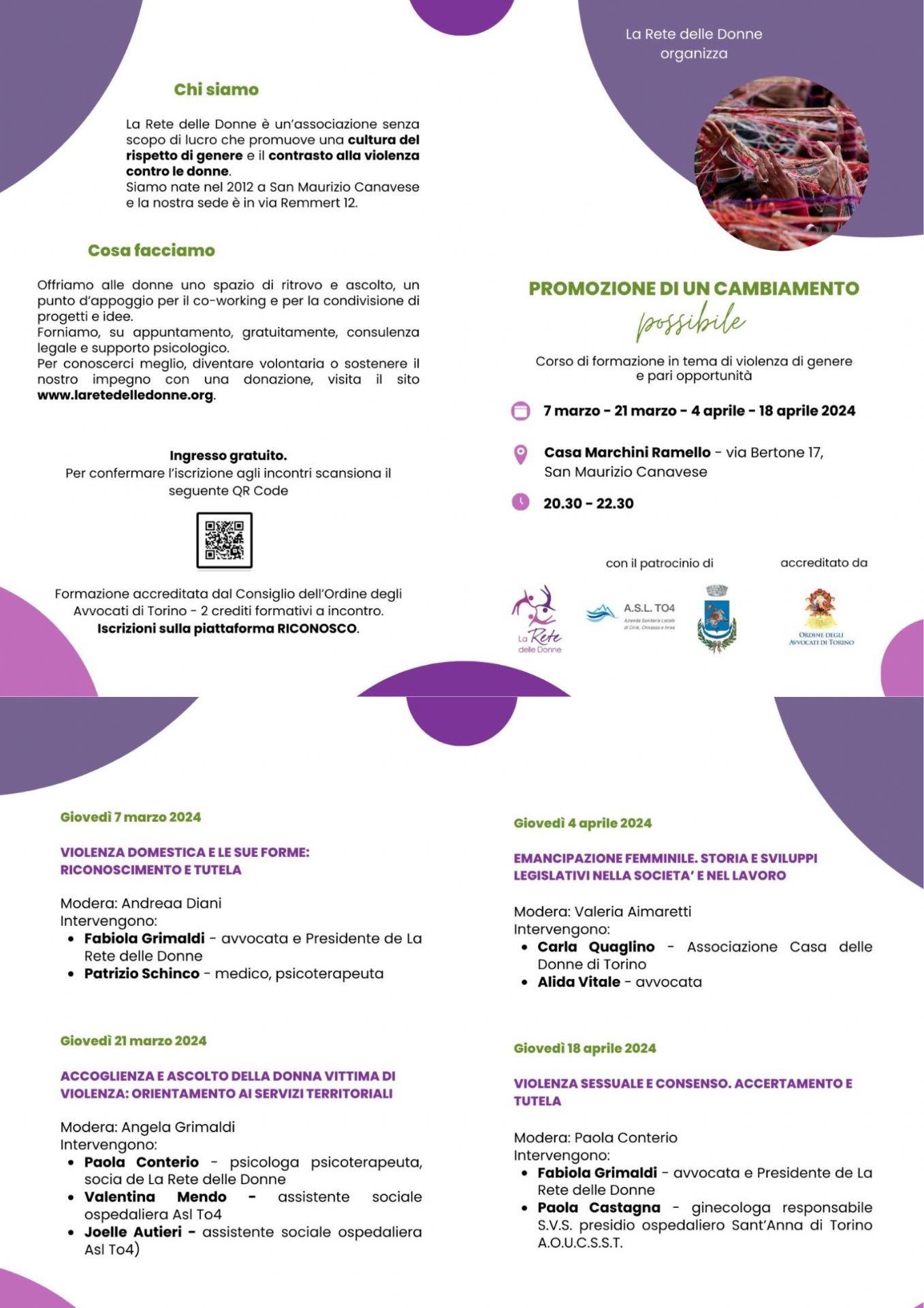 "Promozione di un cambiamento possibile" è il corso di formazione sul tema della violenza di genere e delle pari opportunità organizzato dalla Rete delle Donne in occasione della giornata internazionale della donna con il patrocinio del Comune di San Maurizio Canavese e dell'Asl To4.