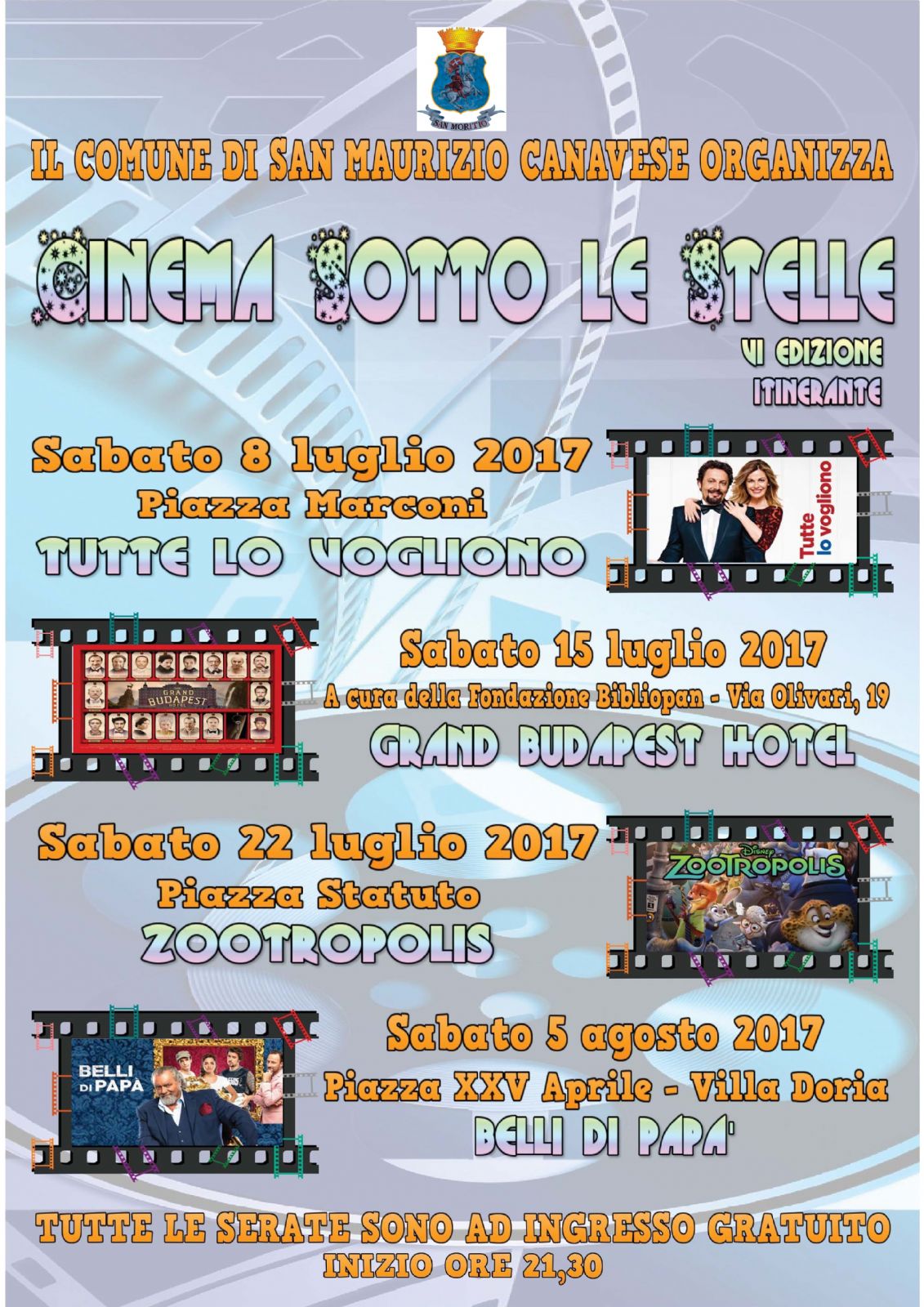 Il Comune di San Maurizio Canavese organizza la sesta edizione di "Cinema sotto le stelle", la rassegna itinerante di proiezioni nelle piazze del paese. Si incomincia sabato 8 luglio in Piazza Marconi con "Tutte lo vogliono", commedia del 2015 con Enrico Brignano e Vanessa Incontrada. Le altre serate in programma saranno il 15 e 22 luglio e il 5 agosto. Le proiezioni avranno inizio sempre alle 21,30 e saranno tutte a ingresso gratuito.