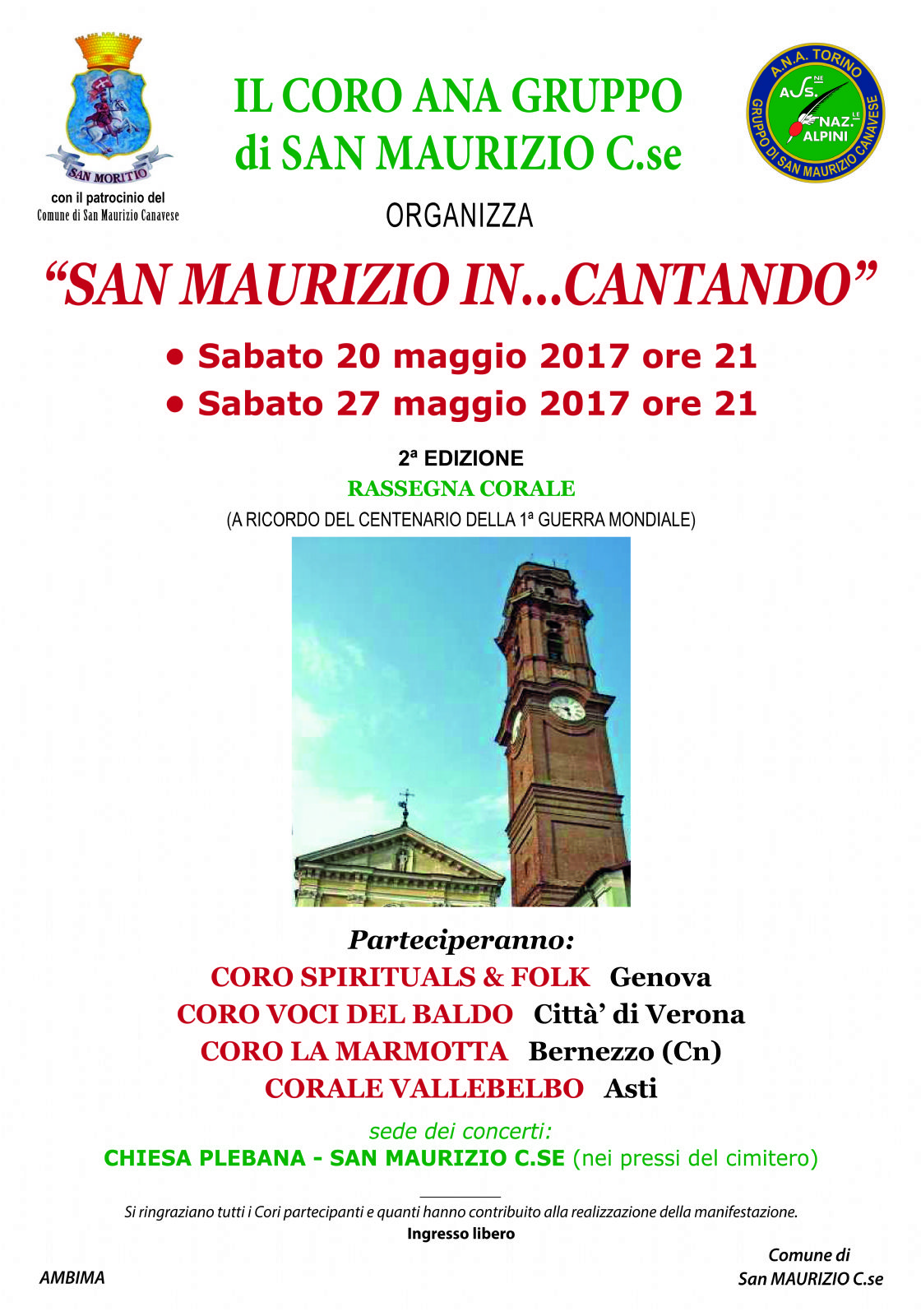 S'intitola “San Maurizio In...cantando” la promettente rassegna corale organizzata dal Gruppo ANA di San Maurizio Canavese con il patrocinio del Comune, in memoria dei cent'anni della Grande Guerra. Si tratta di due serate – sabato 20 e sabato 27 maggio – animate da quattro prestigiose formazioni canore: il Coro Spirituals & Folk di Genova, il Coro Voci del Baldo della Città di Verona, il Coro La Marmotta di Bernezzo (CN) e la Corale Vallebelbo di Asti. In entrambe le serate l'appuntamento è alle ore 21 nell'Antica Chiesa Plebana.