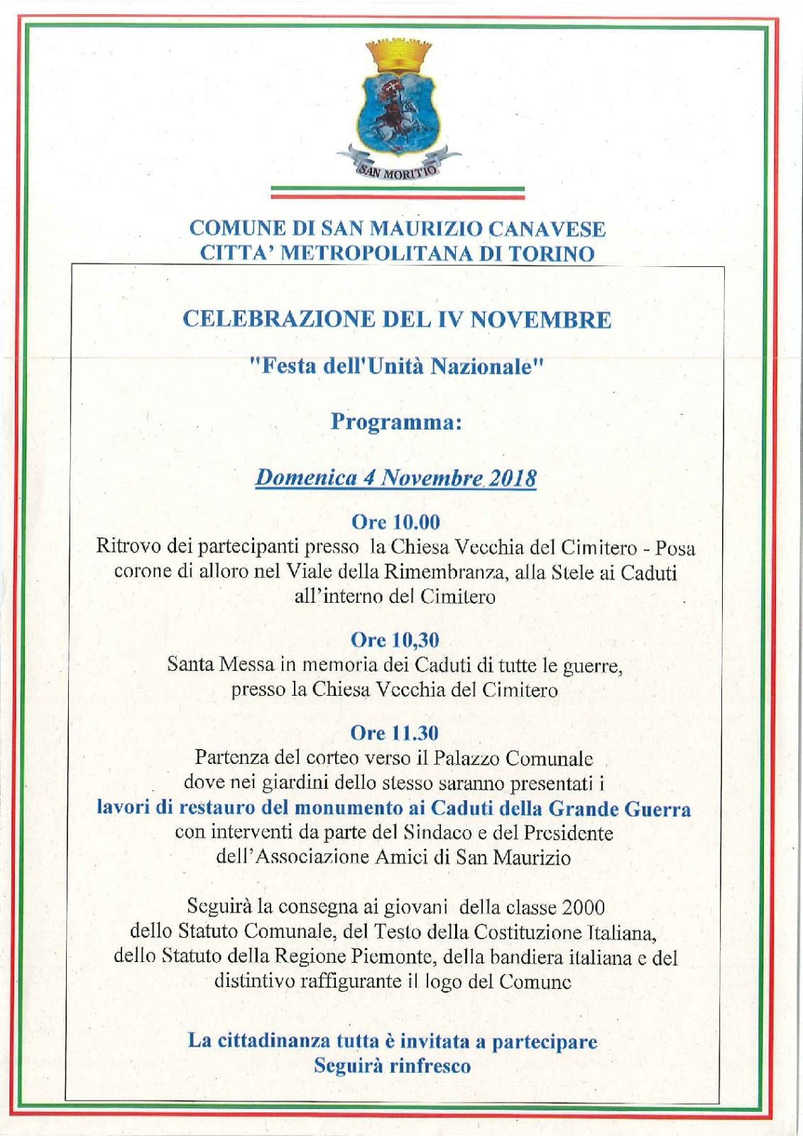 Come di consueto in occasione della celebrazione del IV Novembre, la mattinata si chiuderà con la consegna ai coscritti del testo della Costituzione italiana, degli Statuti del Comune e della Regione Piemonte, della bandiera tricolore e del distintivo con il logo del Comune.