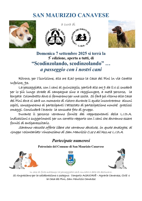 Domenica 7 settembre torna "Scodinzolando, scodinzolando… a passeggio con i nostri cani". L'iniziativa, giunta alla quinta edizione, è organizzata dagli Amici di San Maurizio e dalla Lida (Lega Italiana dei Diritti dell'Animale) con il patrocinio del Comune di San Maurizio Canavese.