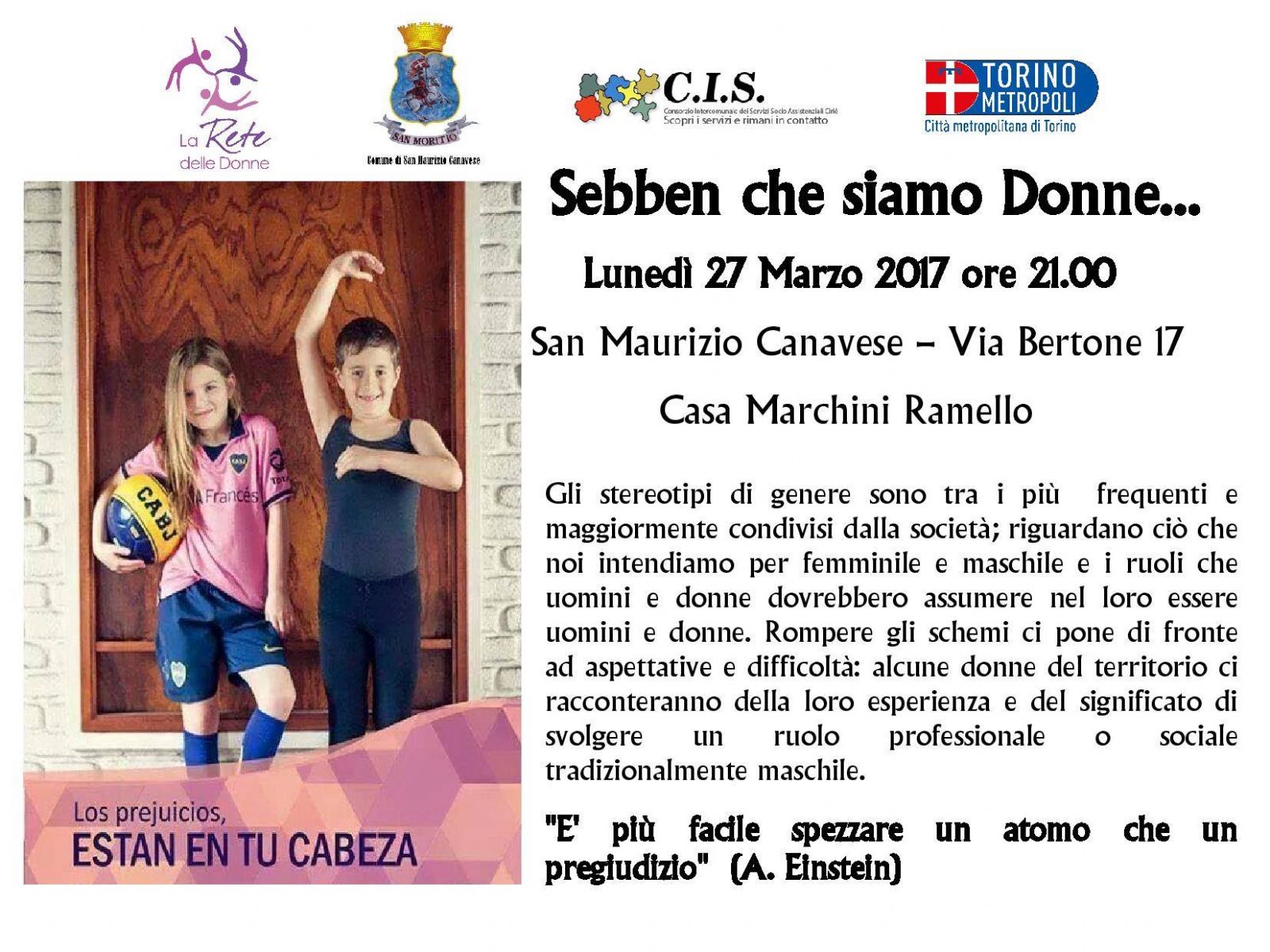 “Sebben che siamo Donne...” è il titolo dell'originale e interessante incontro proposto dalla Rete delle Donne per lunedì prossimo, 27 marzo, alle ore 21 presso Casa Marchini Ramello (in via Bertone 17, a San Maurizio Canavese). Alcune donne del territorio, impegnate in ruoli professionali e sociali considerati tradizionalmente “maschili”, racconteranno la loro esperienza. Un'opportunità per riflettere e rompere schemi e pregiudizi. L'evento è patrocinato dal Comune di San Maurizio Canavese, dal CIS e dalla Città Metropolitana di Torino.