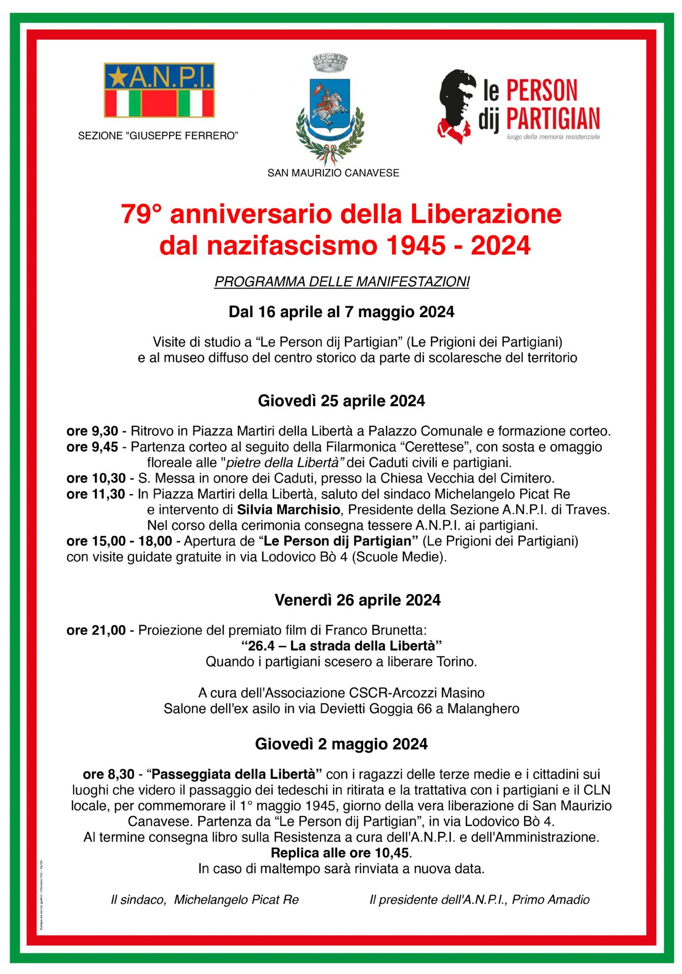 Infine, giovedì 2 maggio, “Passeggiata della Libertà” insieme ai ragazzi di terza media e ai cittadini sui luoghi che videro il passaggio dei tedeschi in ritirata e la trattativa con i partigiani e il CLN locale, per commemorare il 1° maggio 1945, giorno della vera liberazione di San Maurizio Canavese. Partenza dalle Person dij Partigian.