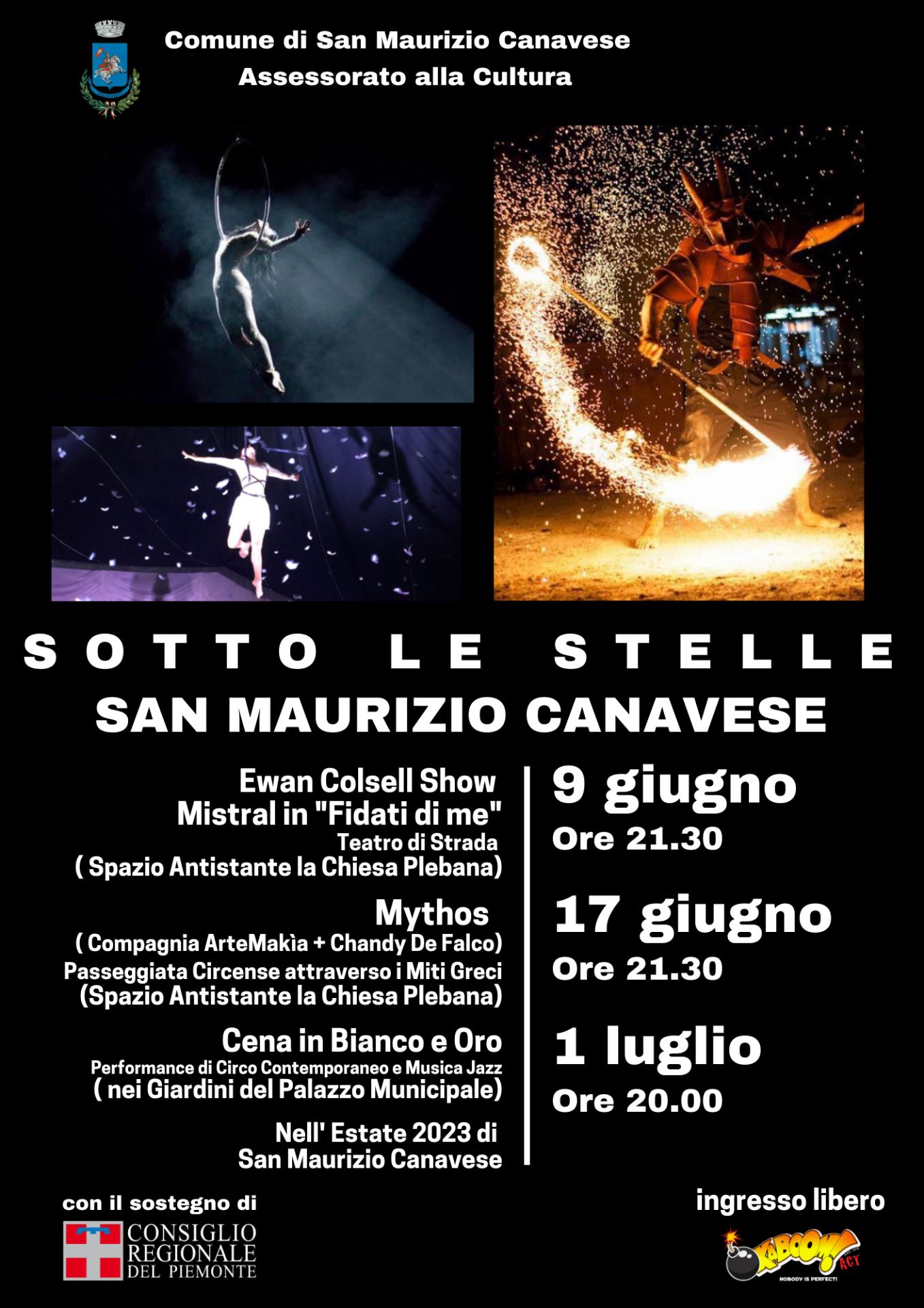 Prende il via questa settimana “Sotto le Stelle”, la speciale rassegna di tre serate dedicate all'arte, al teatro di strada, al circo, alla musica e al desiderio di vivere insieme la magica atmosfera che la nostra San Maurizio Canavese ci offre tra la primavera e l'estate. Si parte con il teatro di strada questo venerdì, 9 giugno alle 21.30, sul prato antistante l'Antica Chiesa Plebana. Stesso luogo e stessa ora per il secondo appuntamento in programma sabato 17 giugno e dedicato ad una originale passeggiata circense attraverso i miti greci. Chiuderà, sabato 1° luglio alle ore 20, la Cena in bianco e oro nei giardini del municipio, allietata da performance di circo contemporaneo e musica jazz. Tutti gli eventi sono gratuiti e aperti a tutti.