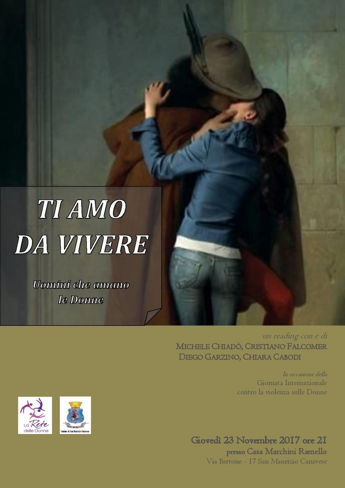 Giovedì 23 novembre, in occasione della Giornata Internazionale contro la violenza sulle donne, la Rete delle Donne, con il patrocinio del Comune di San Maurizio Canavese, propone "Ti amo da vivere - Uomini che amano le donne", un reading di e con Michele Chiadò, Cristiano Falcomer, Diego Garzino, Chiara Cabodi.