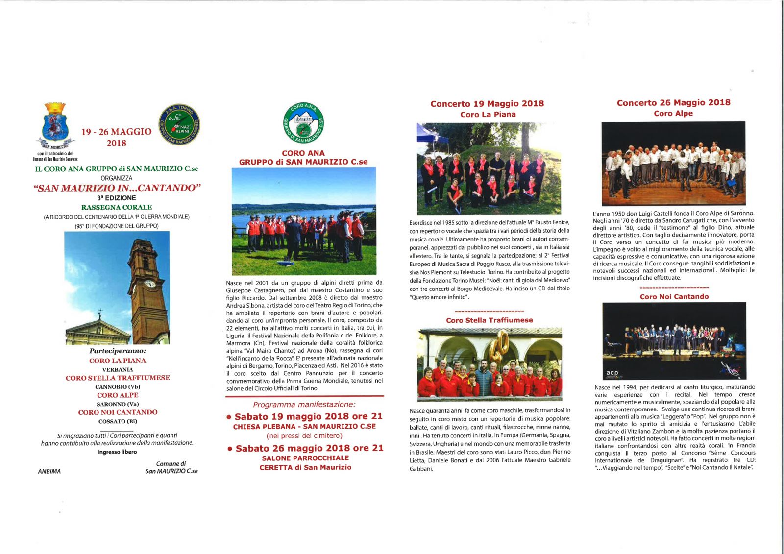 Doppio fine settimana in compagnia degli Alpini. Il Coro Ana Gruppo di San Maurizio Canavese, con il patrocinio del Comune, organizza la terza edizione della rassegna corale “San Maurizio In...cantando”. Due serate speciali – sabato 19 e sabato 26 maggio – animate, oltre che dal Coro Ana sanmauriziese, da quattro prestigiose formazioni canore: il Coro La Piana di Verbania, il Coro Stella Traffiumese di Cannobio, il Coro Alpe di Saronno e il Coro Noi Cantando di Cossato.