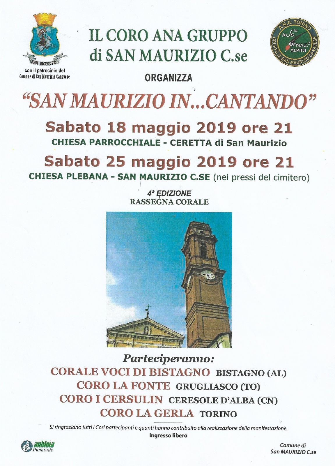 Doppio fine settimana in compagnia degli Alpini. Il Coro Ana Gruppo di San Maurizio Canavese, con il patrocinio del Comune, organizza la quarta edizione della rassegna corale “San Maurizio In...cantando”. Il primo appuntamento è per sabato 18 maggio, alle ore 21, nella chiesa parrocchiale di Ceretta; il secondo sarà invece la settimana successiva, sabato 25, sempre alle ore 21, nella chiesa vecchia del cimitero.