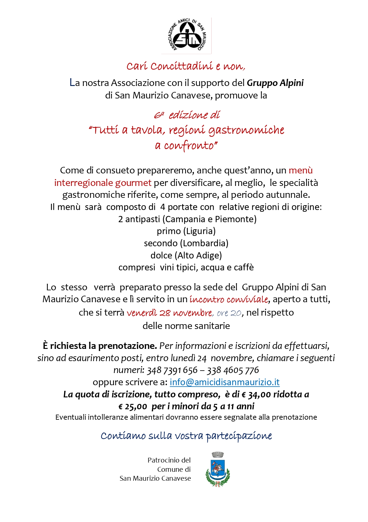 Sesta edizione di "Tutti a tavola, regioni gastronomiche a confronto", la bella iniziativa promossa dall'associazione Amici di San Maurizio in collaborazione con il Gruppo Alpini e con il patrocinio del Comune.