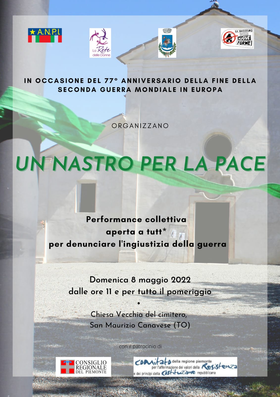Domenica 8 maggio, a partire dalle ore 11, presso la Chiesa Vecchia del Cimitero si svolgerà la commemorazione del 77° anniversario della fine della Seconda Guerra Mondiale in Europa, con la performance “Un nastro per la pace”, per denunciare l'ingiustizia della guerra.
