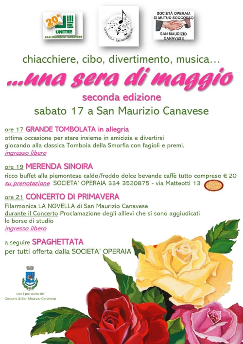 Unitre, La Novella e Società Operaia di Mutuo Soccorso organizzano la seconda edizione di "Una sera di maggio - Chiacchiere, cibo, divertimento musica". L'appuntamento è per sabato 17 maggio alla Società Operaia alle ore 17 per la grande tombolata (ingresso libero). Alle ore 19 merenda sinoira (su prenotazione). Alle ore 21 Concerto di Primavera (ingresso libero). Gran finale con spaghettata per tutti offerta dalla Società Operaia.