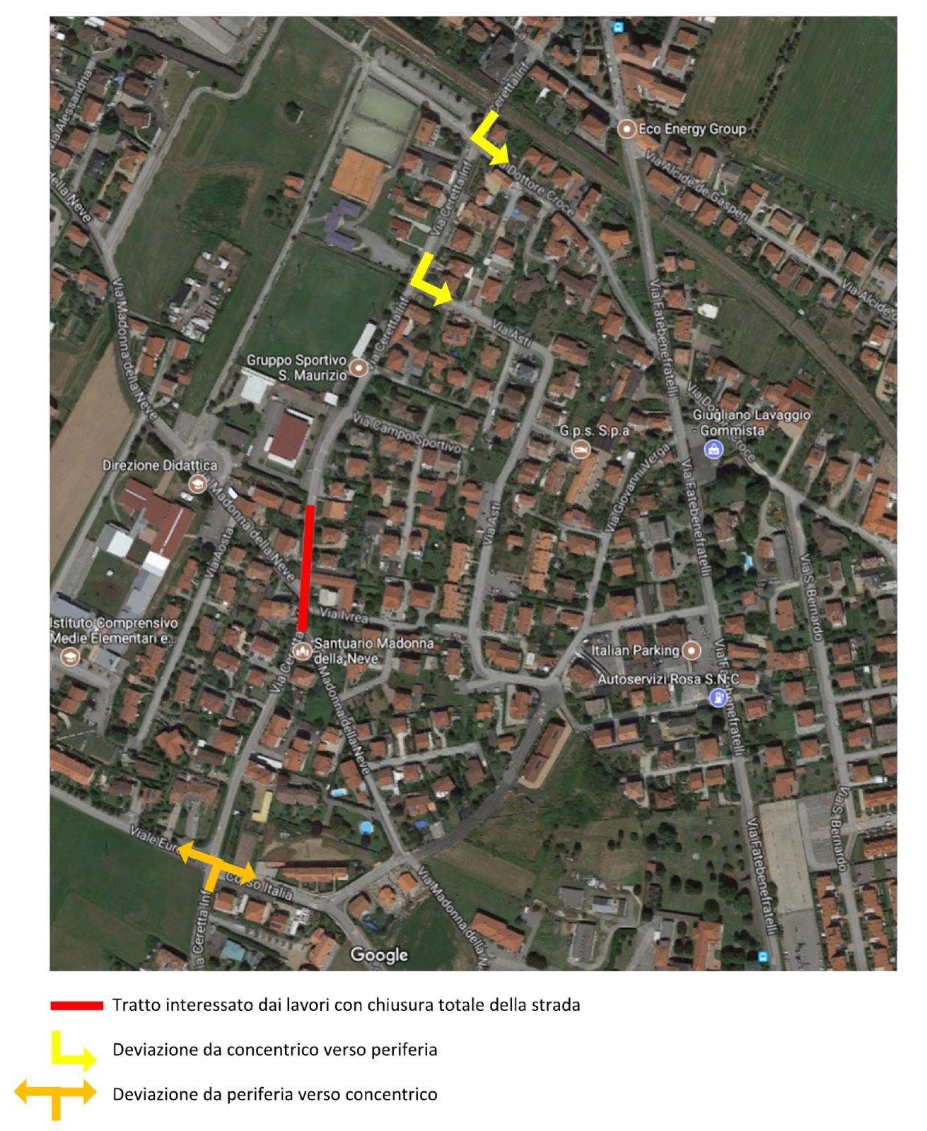 - seconda opzione: svolta sinistra in via Asti, poi svolta a destra in via Verga, ancora a destra in Corso Italia, infine a sinistra in via Ceretta Inferiore