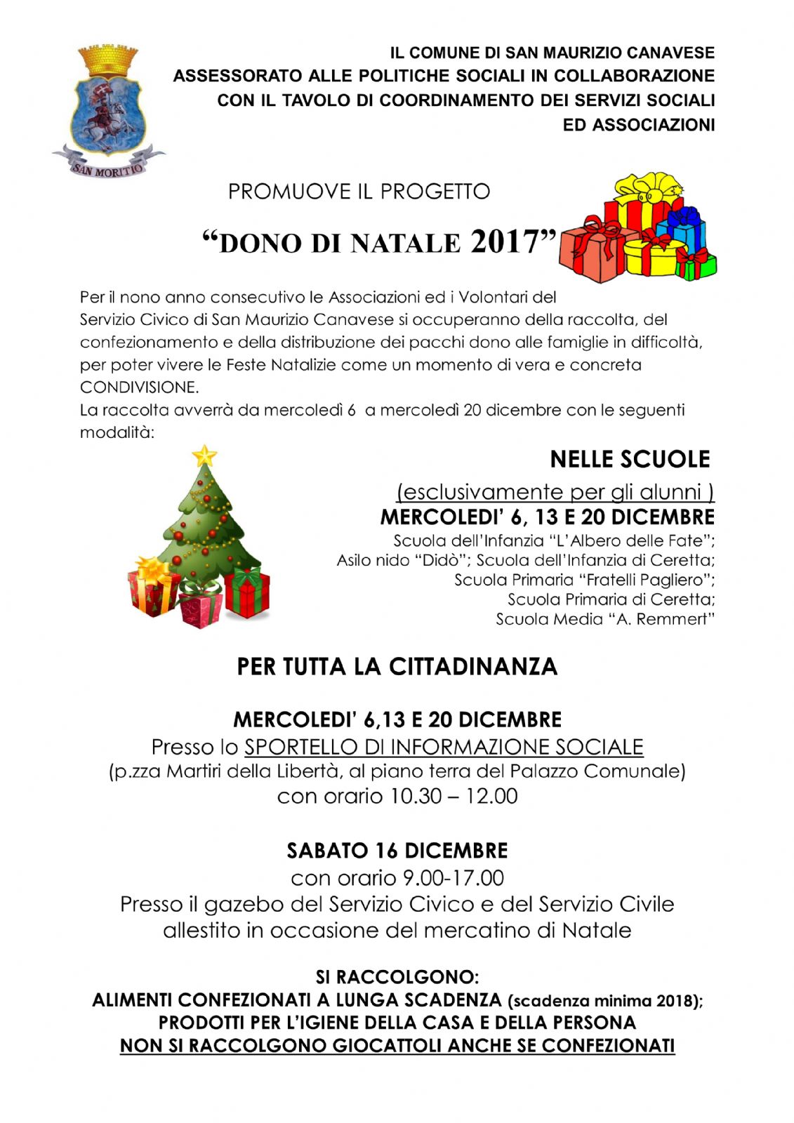 Anche quest'anno l'Assessorato alle Politiche Sociali, in collaborazione con il Tavolo di Coordinamento dei Servizi Sociali e Associazioni, promuove il progetto DONO DI NATALE. Le Associazioni e i Volontari del Servizio Civico e del Servizio Civile raccoglieranno, confezioneranno e distribuiranno dei pacchi dono alle famiglie in difficoltà, in occasione del Natale.