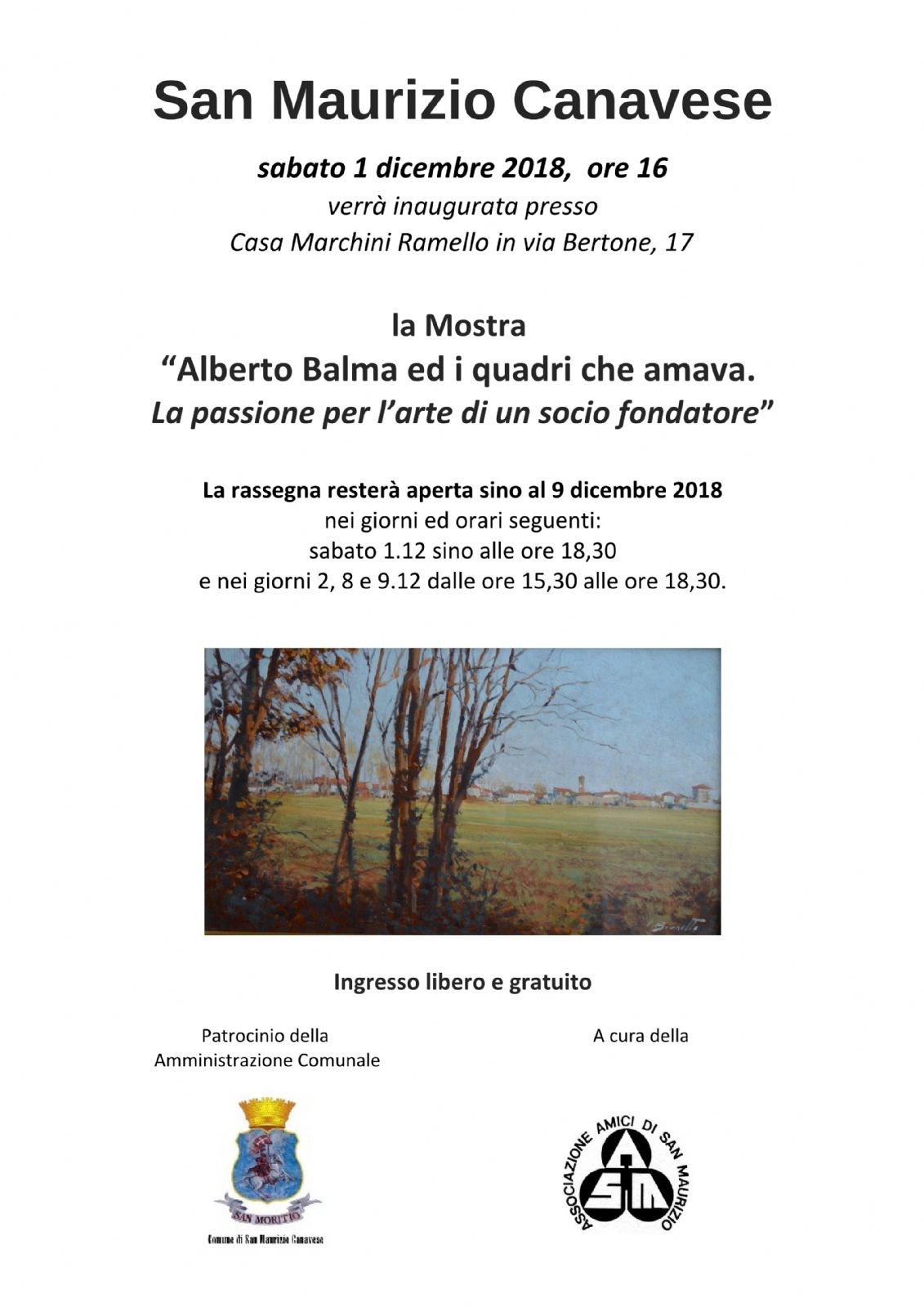 Sarà inaugurata sabato prossimo, 1° dicembre, la mostra “Alberto Balma e i quadri che amava. La passione per l'arte di un socio fondatore”, realizzata dall'Associazione Amici di San Maurizio con il patrocinio dell'Amministrazione comunale. L'appuntamento è alle ore 16 a Casa Marchini Ramello (in via Bertone, 17). La mostra resterà aperta fino al 9 dicembre, nei giorni e negli orari indicati nella locandina in immagine. L'ingresso è libero e gratuito.