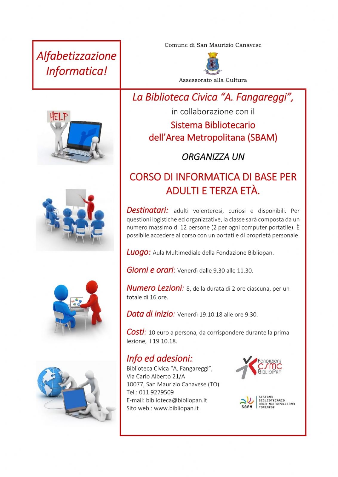 Incomincerà la prossima settimana – per la precisione venerdì 19 ottobre – la seconda edizione del corso di informatica di base destinato agli adulti e alla terza età. Ad organizzarlo, anche quest'anno, è la Biblioteca Civica “A. Fangareggi”, in collaborazione con Il Sistema Bibliotecario dell’Area Metropolitana (SBAM). Le lezioni si volgeranno presso l’aula multimediale della Fondazione Bibliopan il venerdì, dalle 9.30 alle 11.30.