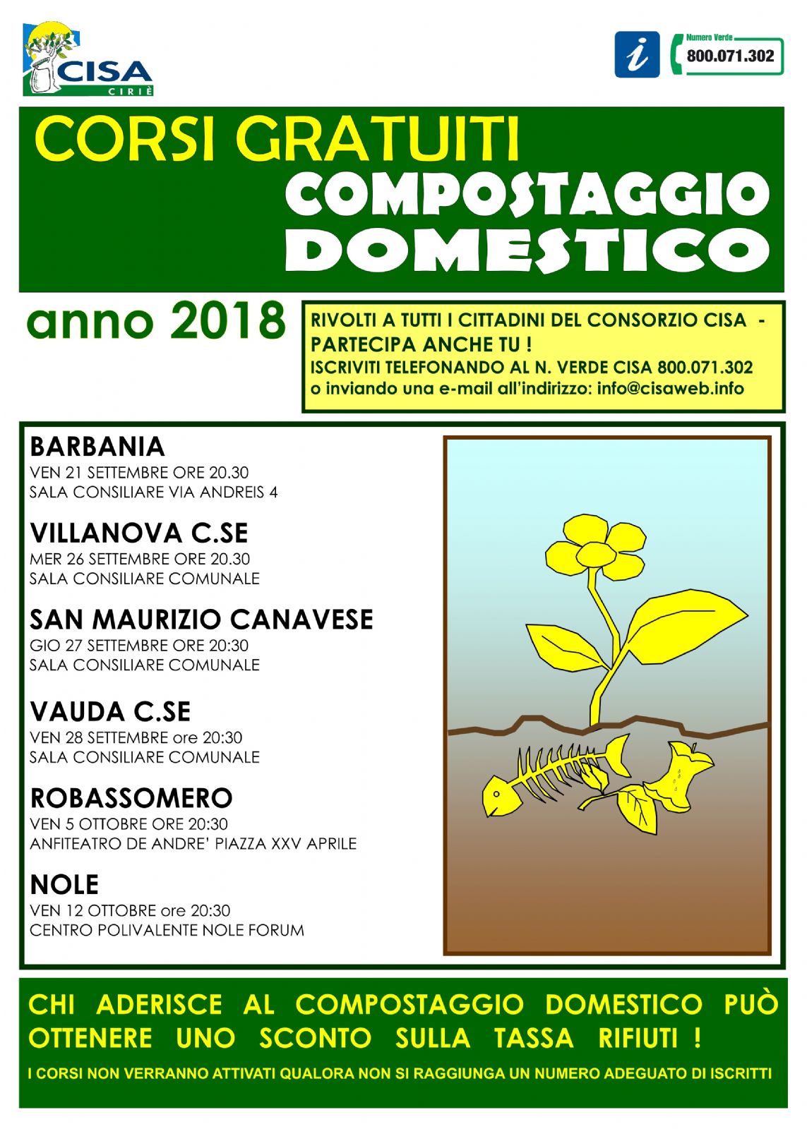 Il corso di compostaggio domestico, naturalmente, è gratuito. Per iscriversi basta telefonare al numero verde del CISA 800 071302 oppure scrivere a info@cisaweb.info.
