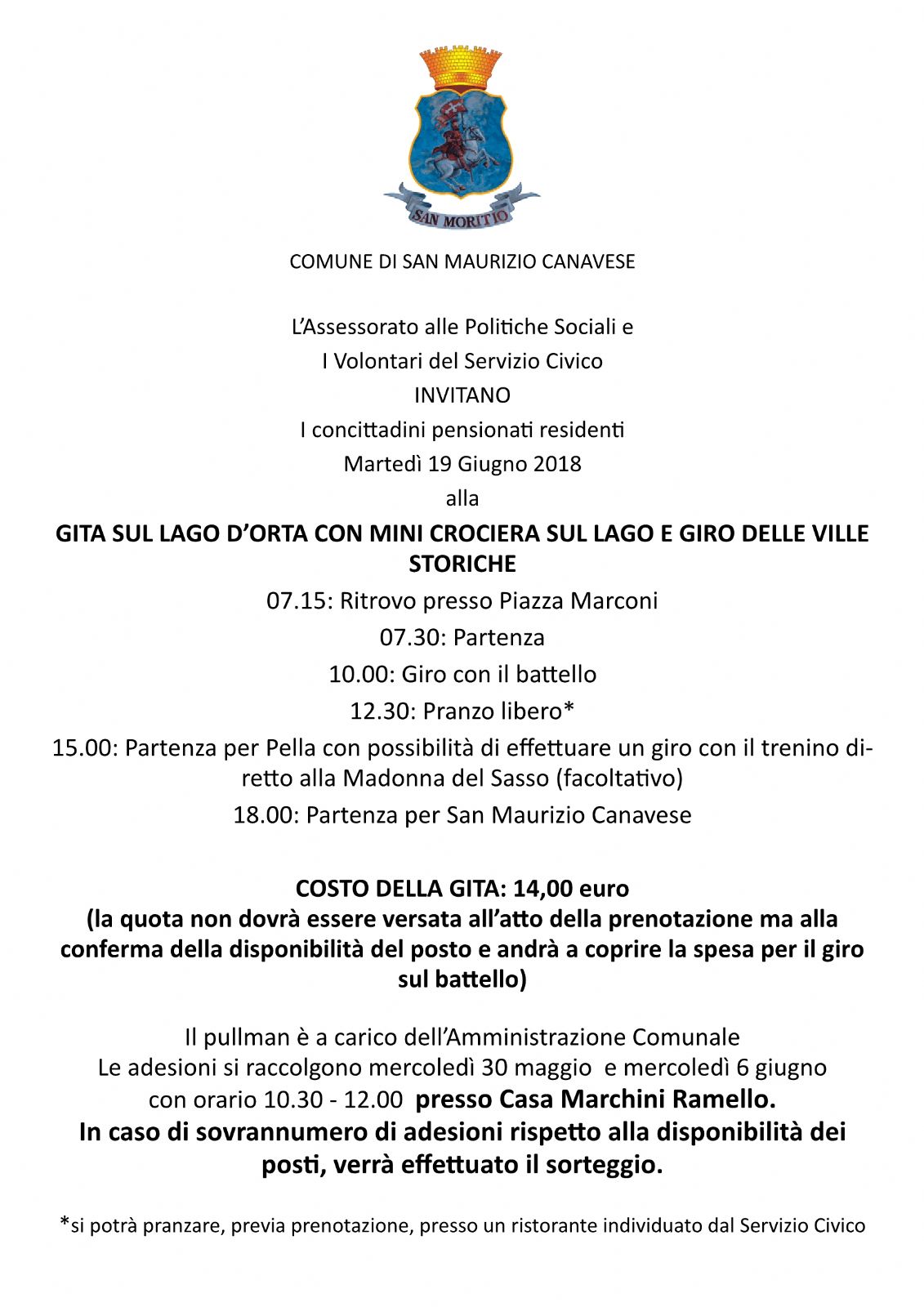 Una gita sul Lago d'Orta per i pensionati sanmauriziesi. È l'iniziativa organizzata dall'Assessorato alle Politiche Sociali del Comune di San Maurizio Canavese e dei Volontari del Servizio Civico per martedì 19 giugno. Il costo è di 14 euro e coprirà la spesa per il biglietto della mimicrociera sul lago, mentre il trasporto in autobus sarà offerto dall'Amministrazione comunale.