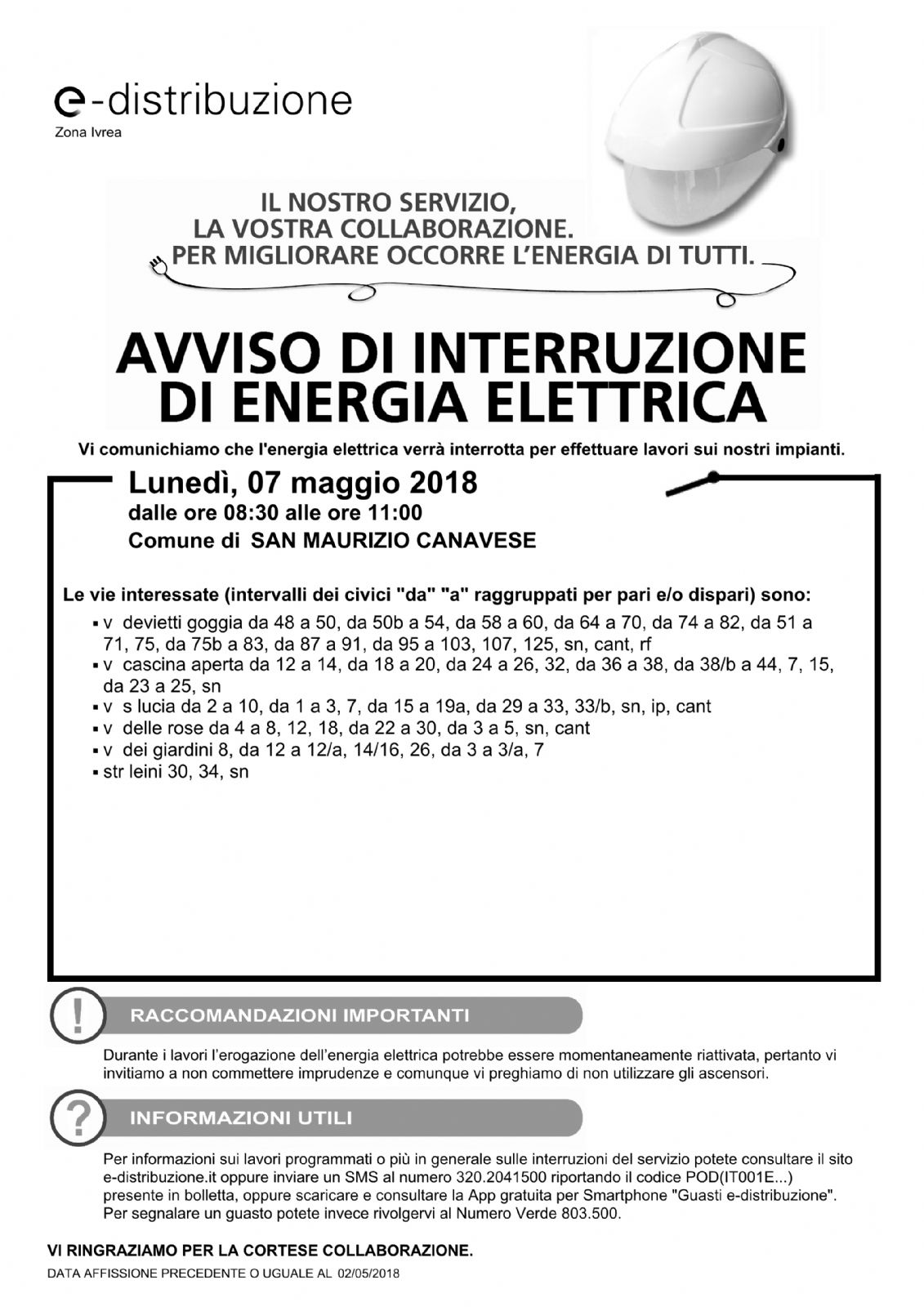Possibili disagi, nella mattinata di lunedì 7 maggio, a Malanghero, a causa dell'interruzione nell'erogazione di energia elettrica. Nell'immagine, l'avviso ricevuto dal nostro Comune con le vie e i numeri civici interessati.