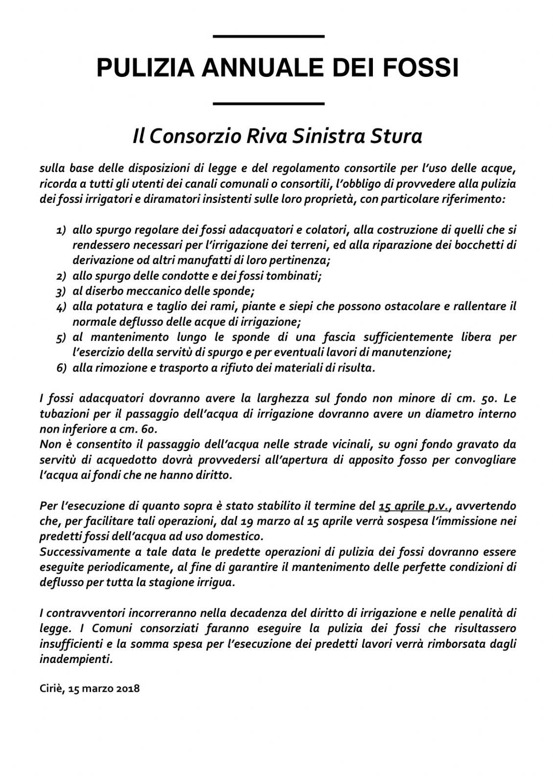 Il Consorzio Riva Sinistra Stura, sulla base delle disposizioni di legge e del regolamento consortile per l’uso delle acque, ricorda a tutti gli utenti dei canali comunali o consortili, l’obbligo di provvedere alla pulizia dei fossi irrigatori e diramatori insistenti sulle loro proprietà, con particolare riferimento: