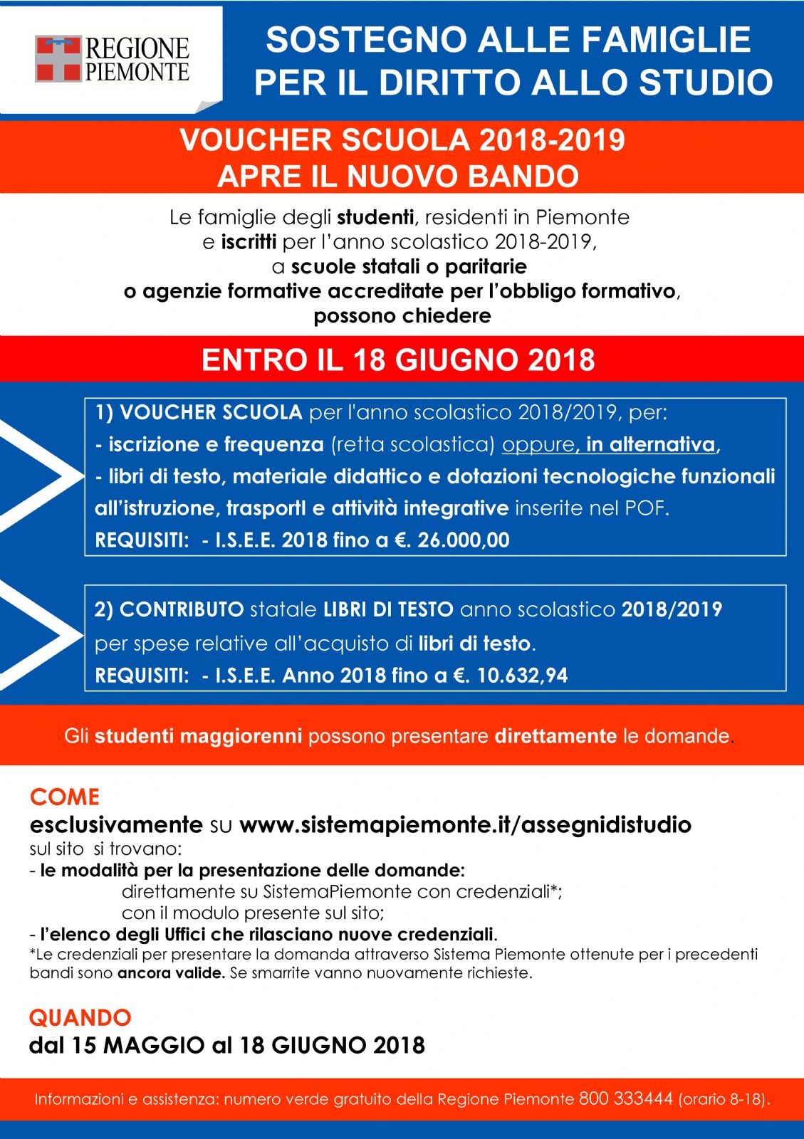 Le famiglie degli studenti, residenti in Piemonte e iscritti per l'anno scolastico 2018-2019 a scuole statali o paritarie o agenzie formative accreditate per l'obbligo formativo, potranno richiedere: