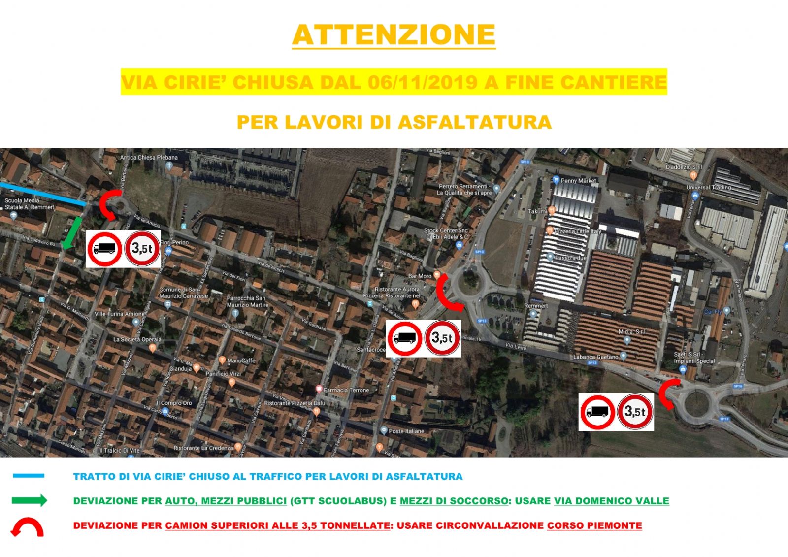 Proseguono i lavori di riasfaltatura della via Ciriè. Nella giornata di oggi saranno completate le operazioni di fresatura della strada, che finora hanno consentito di mantenere la via aperta al traffico. Da domani, mercoledì 6 novembre, sarà invece posato il manto di asfalto e questa operazione richiederà la chiusura totale di via Ciriè per alcuni giorni. Le automobili e i mezzi pubblici e di soccorso potranno transitare in via Valle per poi proeguire lungo via Matteotti, mentre il traffico pesante superiore alle 3,5 tonnellate in arrivo da San Francesco al Campo e da Leinì sarà deviato sulla circonvallazione corso Piemonte. Grazie a tutti per la pazienza e per la collaborazione dimostrata in questi primi giorni di lavori.