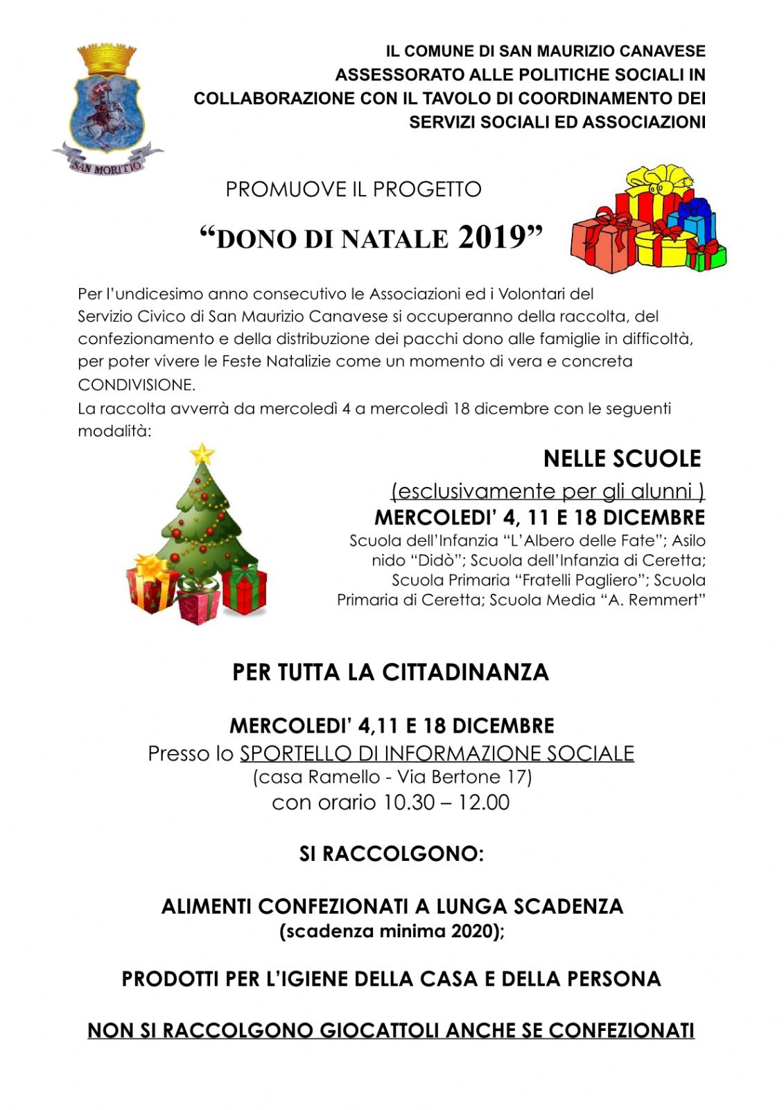 Domani, mercoledì 18 dicembre, terzo e ultimo giorno di raccolta del DONO DI NATALE, il progetto promosso per l'undicesimo anno consecutivo dall'Assessorato alle Politiche Sociali del Comune di San Maurizio Canavese, in collaborazione con il Tavolo di Coordinamento dei Servizi Sociali e Associazioni. Da due mercoledì infatti le Associazioni e i Volontari del Servizio Civico stanno raccogliendo doni che confezioneranno e distribuiranno alle famiglie in difficoltà.