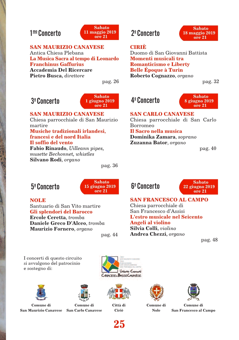 Torna come ogni anno, ma sempre più grande e coinvolgente, Organalia, la nota rassegna concertistica per la promozione della musica organistica e strumentale promossa dalla Città Metropolitana di Torino con il sostegno della Fondazione CRT e il patrocinio della Regione Piemonte e del Consiglio Regionale del Piemonte. Il circuito di Organalia 2019 si svolgerà dal 4 maggio al 21 luglio su quattro aree omogenee del territorio della Città Metropolitana di Torino: Ciriacese e Basso Canavese, Moncalierese, Canavese e Valli di Lanzo, Ceronda e Casternone per 19 appuntamenti complessivi. Per quanto riguarda la nostra area (Ciriacese e Basso Canavese), sono in calendario concerti a Ciriè, San Carlo, Nole, San Francesco al Campo e nella nostra San Maurizio, che avrà l'onore di ospitare ben due eventi.