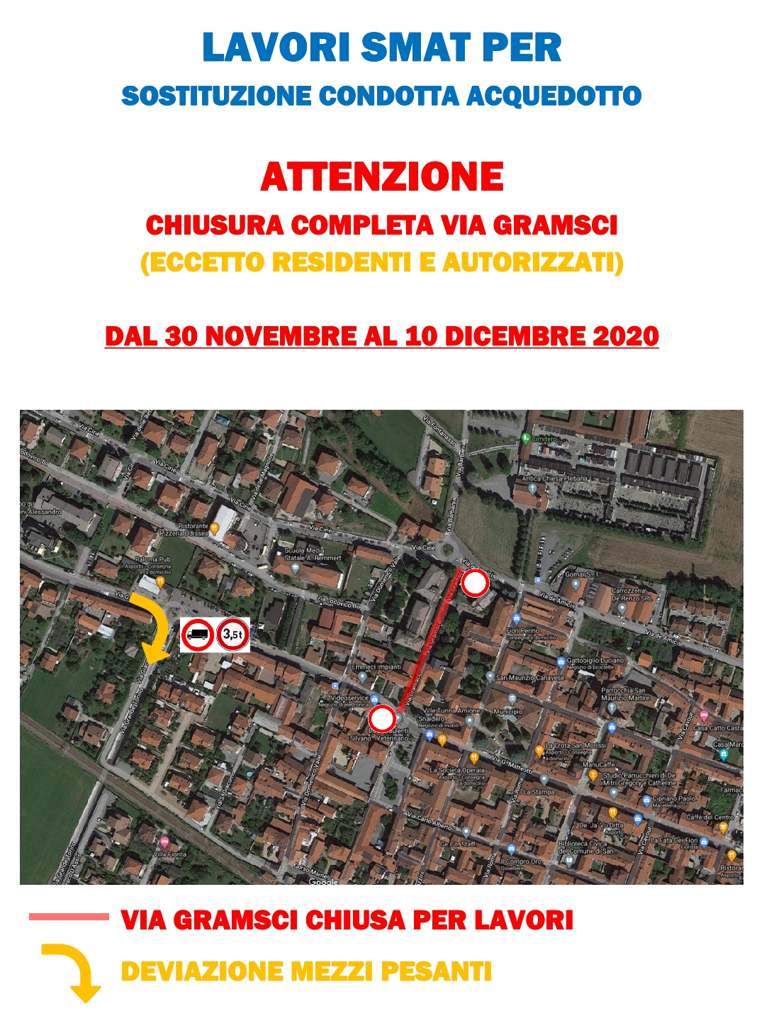 A partire da lunedì prossimo, 30 novembre, SMAT procederà alla sostituzione della conduttura dell'acqua potabile in via Gramsci. Per un paio di settimane dalle ore 7 alle ore 18 la via sarà chiusa al transito di tutti i veicoli, ad eccezione di residenti e autorizzati. Il traffico pesante in arrivo da Ciriè non potrà attraversare il concentrico ma dovrà svoltare a destra alla prima rotonda di accesso in paese, transitando dunque sul cavalcaferrovia, oppure alla rotonda successiva e percorrere via Grande Torino.