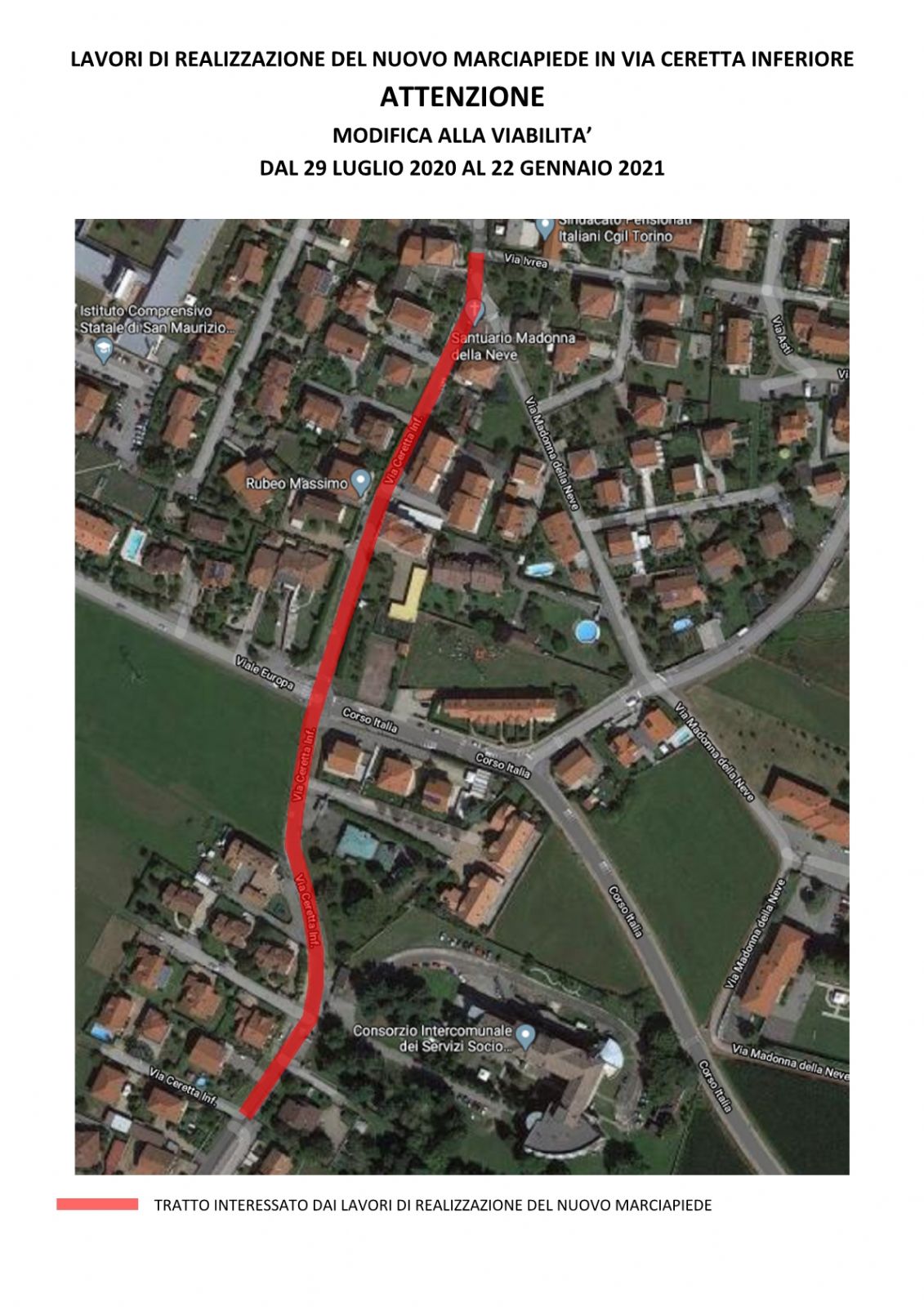 Parte in questi giorni il cantiere per la realizzazione del nuovo marciapiede in via Ceretta Inferiore, nel tratto compreso fra via Madonna delle Neve e l'ingresso della Casa dei Pini. Si tratta di un'opera di particolare importanza per garantire maggiore sicurezza su una strada percorsa a piedi da numerosi cittadini. Il marciapiede correrà sul lato destro della via, procedendo in direzione Ceretta, e sarà ultimato entro il mese di gennaio. Grazie a questa nuova opera sarà di fatto possibile raggiungere la Casa dei Pini dal concentrico a piedi in tutta sicurezza: da piazza Marconi basterà infatti imboccare il marciapiede che costeggia la pista ciclabile, percorrere un breve tratto di via Madonna della Neve fino a via Ceretta Inferiore, quindi raggiungere la Casa dei Pini camminando in sicurezza sul nuovo marciapiede. Nell'ultimo tratto, compreso tra l'incrocio con viale Europa e la Casa dei Pini, il percorso sarà ciclopedonale e andrà ad integrarsi con il percorso del progetto VELA, la rete di 125 chilometri di piste ciclabili che collegherà tutti i poli della mobilità e i poli attrattivi dei Comuni del territorio.