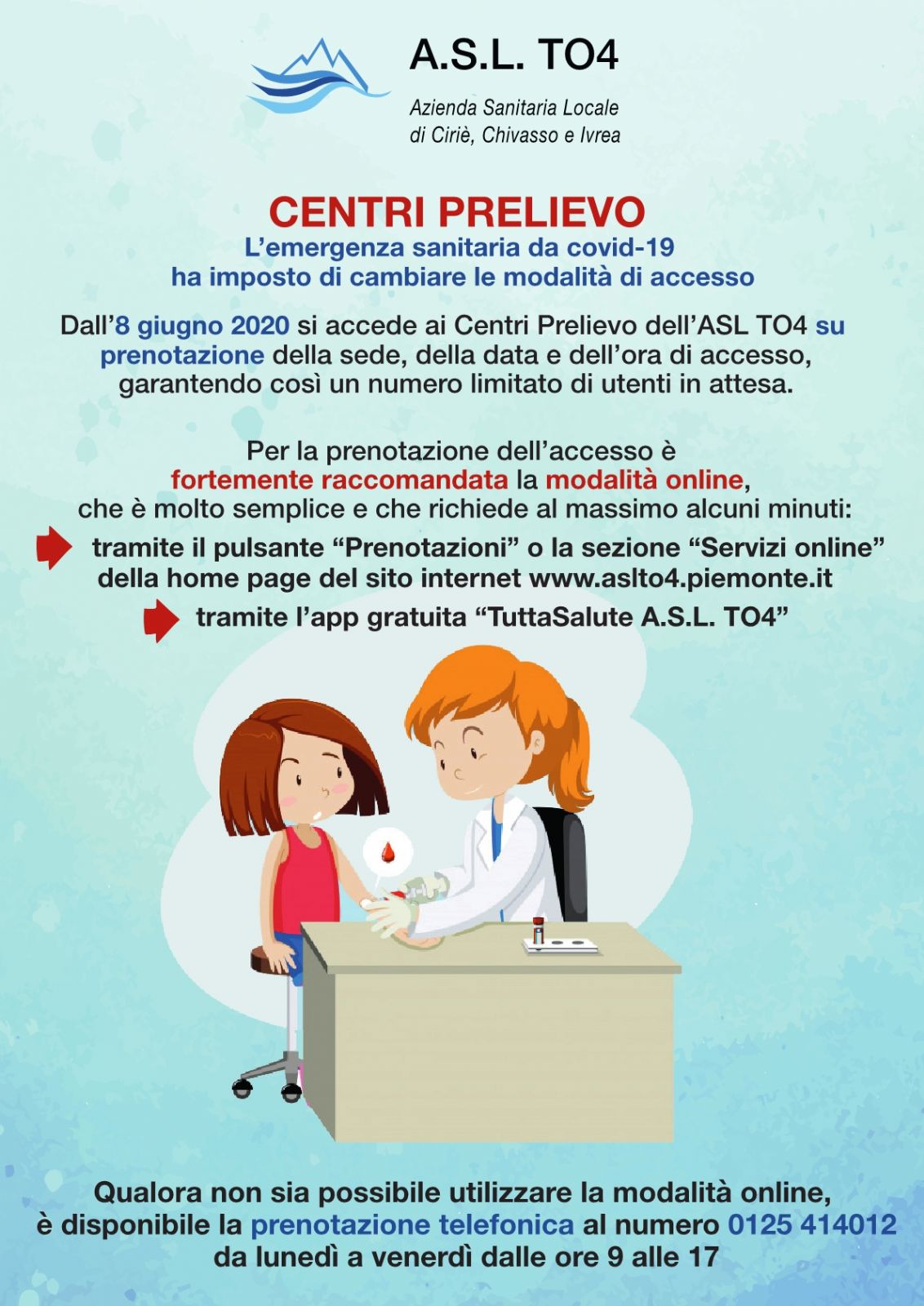 Ricordiamo le nuove modalità di accesso ai Centri Prelievo dell'Asl TO4, in seguito all'emergenza sanitaria determinata dalla pandemia. In sostanza, per evitare assembramenti e per garantire la sicurezza dei cittadini e degli operatori, non sarà più possibile presentarsi liberamente come prima ma sarà necessario prenotare il giorno, l'ora e la sede del prelievo. Per la prenotazione l'Asl raccomanda fortemente la modalità online.