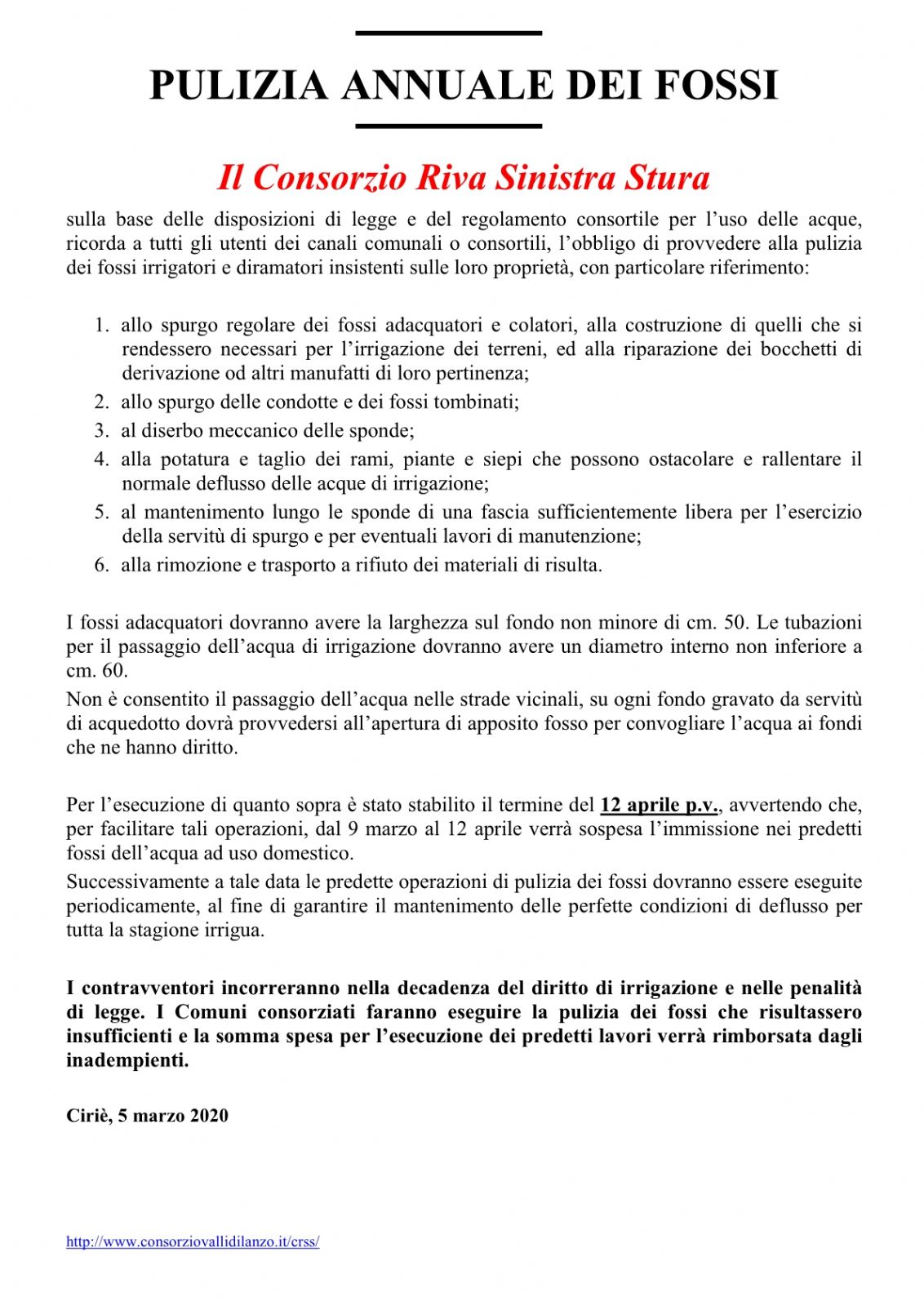 Il Consorzio Riva Sinistra Stura ricorda a tutti gli utenti dei canali comunali e consortili tempi e modalità per la pulizia annuale dei fossi irrigatori e diramatori che insistono sulle rispettive proprietà.