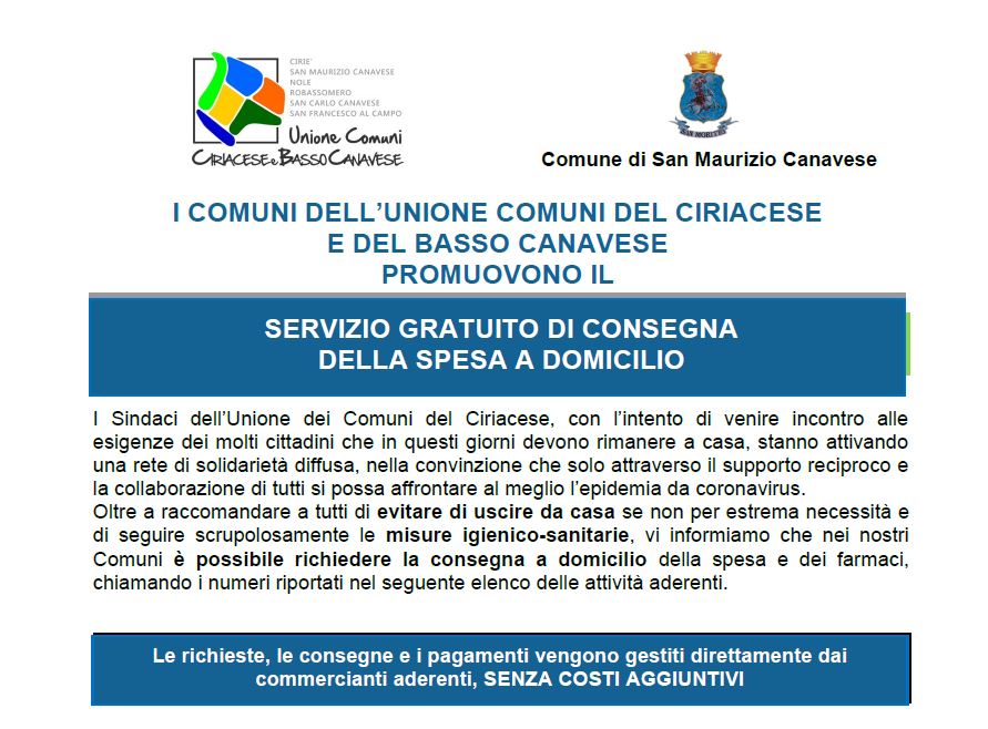 Qui sotto, nell'allegato, trovate l'elenco degli Esercenti e dei Commercianti del nostro Comune che ad oggi hanno dato la propria disponibilità ad offrire il servizio di consegna della spesa a domicilio agli anziani e alle persone a rischio, accogliendo la richiesta dell'Unione dei Comuni del Ciriacese e del Basso Canavese.