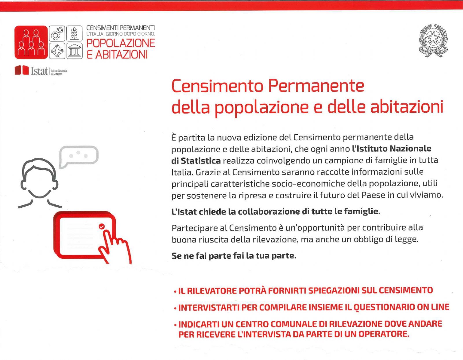 Attenzione però: la rilevazione non coinvolgerà tutta la popolazione, come avveniva un tempo, ma solo le famiglie scelte dall’Istituto nazionale di statistica, le quali verranno contattate tramite lettera direttamente dall’Istat o con visita dei rilevatori muniti di cartellino identificativo.