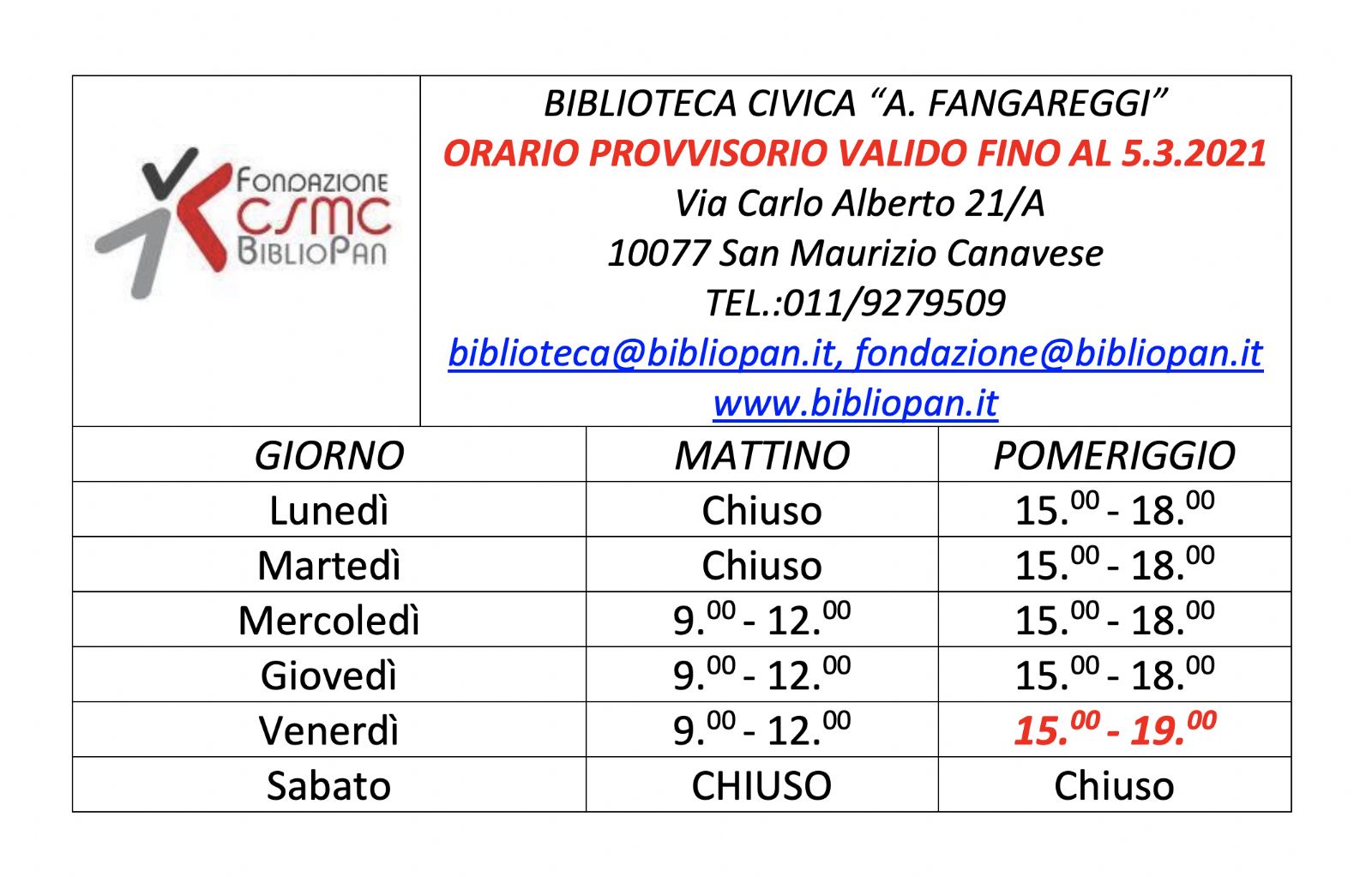 Orario Pomeridiano: dal lunedì al giovedì, dalle 15 alle 18; venerdì: dalle 15 alle 19;