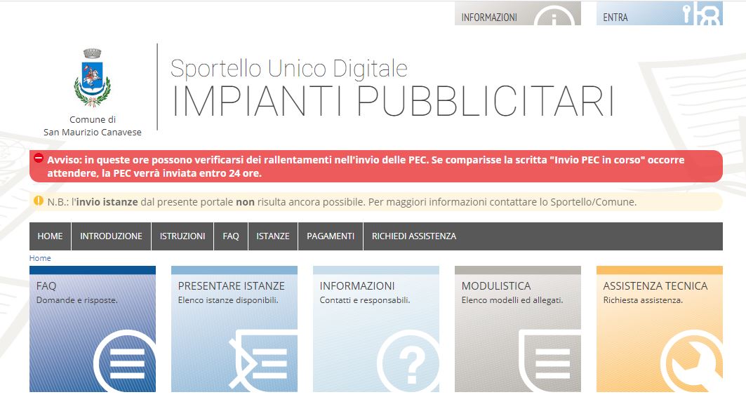 Dal 1° febbraio sarà attivo lo Sportello Unico Digitale degli Impianti Pubblicitari per la trasmissione di istanze di provvedimento amministrativo per impianti pubblicitari da collocare nel territorio comunale. Per agevolare il cambiamento, fino al 28 febbraio sarà comunque possibile la trasmissione delle istanze anche senza l'utilizzo del nuovo sportello. Decorso tale periodo transitorio, quindi a partire dal 1° marzo, la trasmissione di nuove istanze e integrazioni dovrà avvenire esclusivamente attraverso lo Sportello Unico Digitale, cliccando il pulsante Sportello Unico Impianti Pubblicitari sulla homepage del sito.