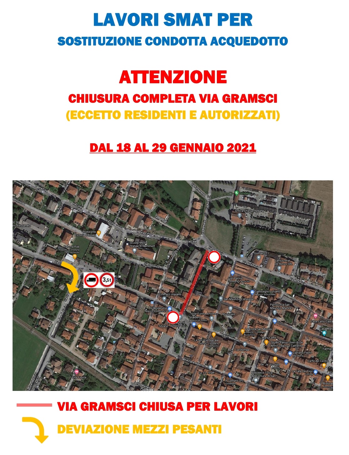 A partire da lunedì prossimo, 18 gennaio, SMAT riprenderà i lavori per la sostituzione della conduttura dell'acqua potabile in via Gramsci. Per una decina di giorni fino al 29 gennaio dalle ore 7 alle ore 18 la via sarà chiusa al transito di tutti i veicoli, ad eccezione di residenti e autorizzati. Il traffico pesante in arrivo da Ciriè non potrà attraversare il concentrico ma dovrà svoltare a destra alla prima rotonda di accesso in paese, transitando dunque sul cavalcaferrovia, oppure alla rotonda successiva e percorrere via Grande Torino.