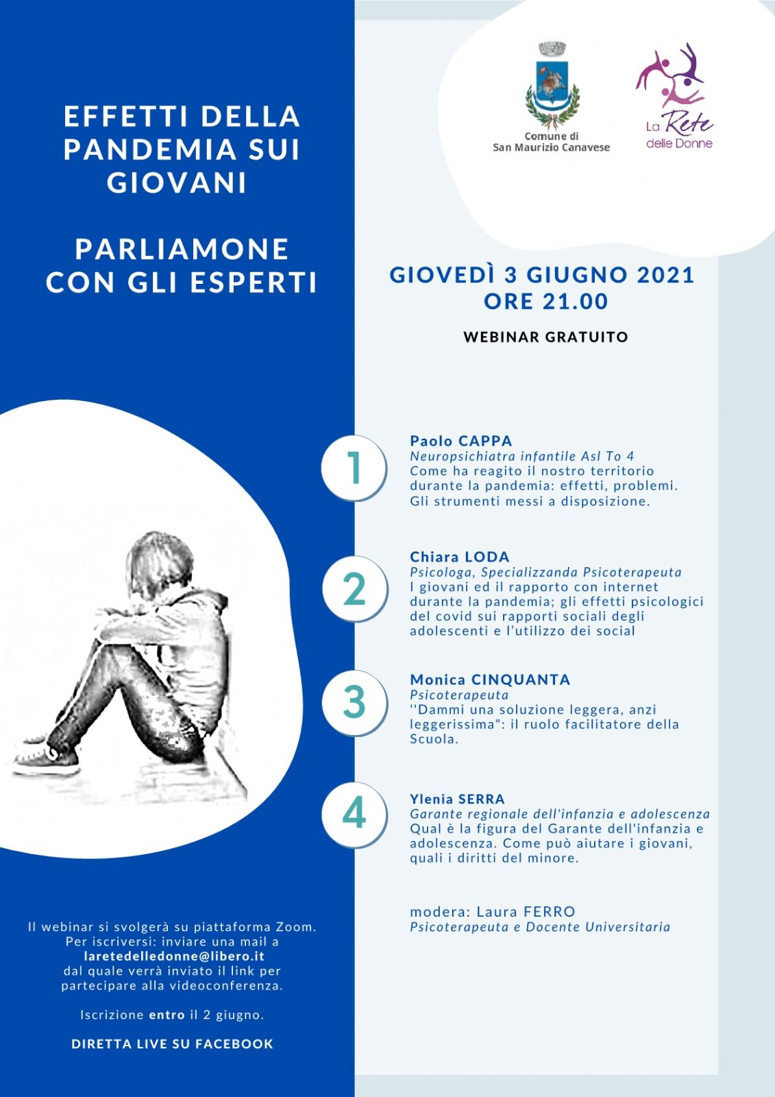 "Effetti della pandemia sui giovani: parliamone con gli esperti" è il webinar gratuito organizzato per giovedì 3 giugno dagli assessorati alle Politiche Giovanili e alle Politiche Sociali del Comune di San Maurizio Canavese e dall'Associazione "La Rete delle Donne", con la collaborazione di alcuni genitori sanmauriziesi, per offrire alle famiglie un punto di confronto e una fonte di informazione sul disagio che la pandemia da Covid-19 ha provocato e sta provocando ai giovani in età scolare.