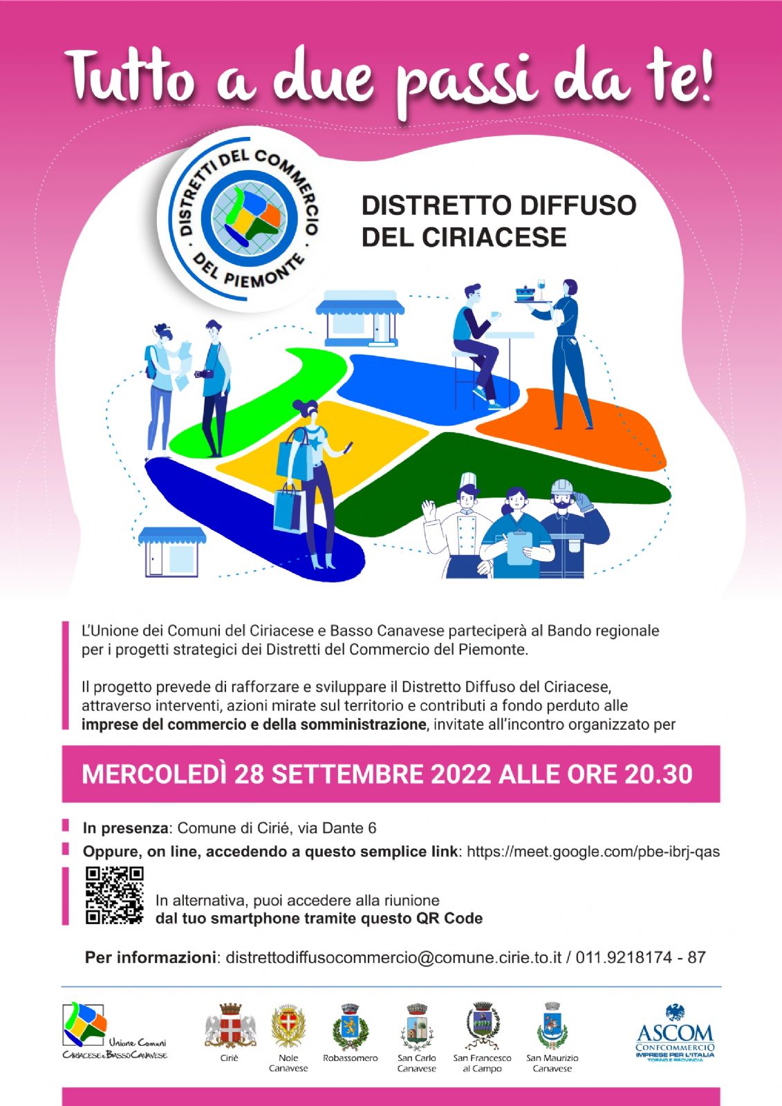 Questa sera, mercoledì 28 settembre alle ore 20.30, a Palazzo D'Oria a Ciriè, si svolgerà un incontro di presentazione del progetto di sviluppo del Distretto Diffuso del Ciriacese, per il quale l'Unione dei Comuni del Ciriacese e del Basso Canavese parteciperà allo bando regionale dedicato.