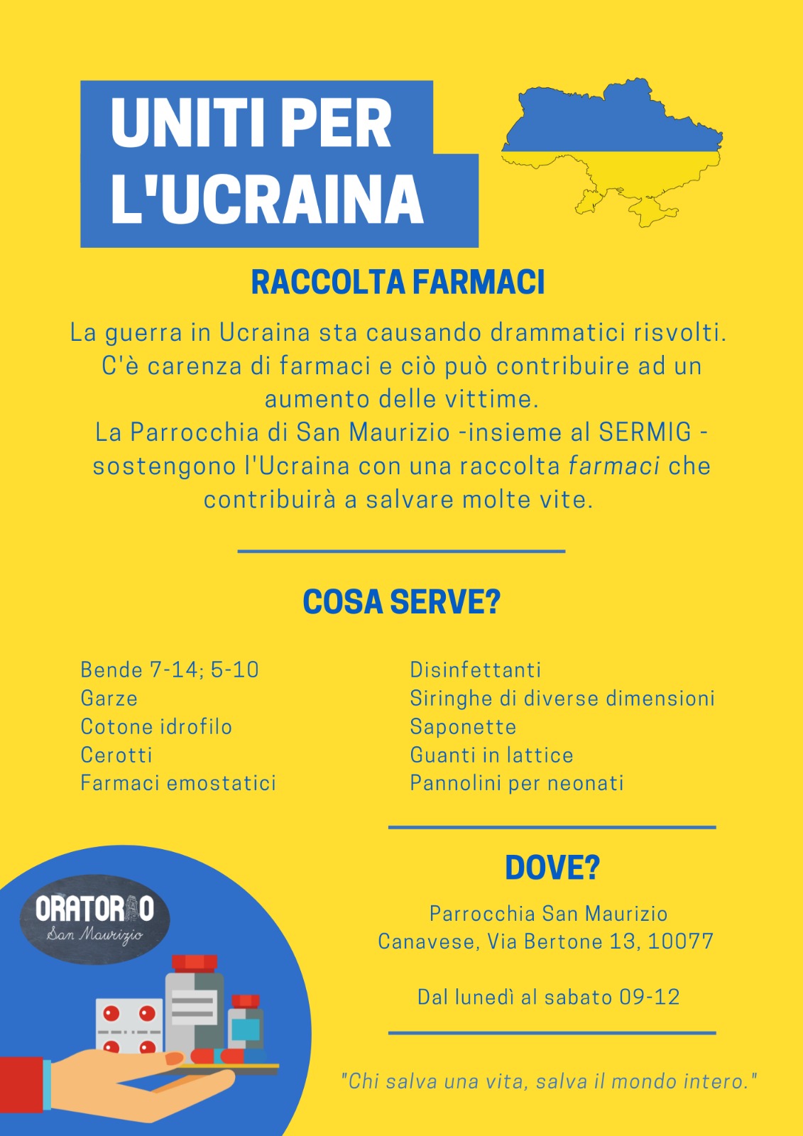 La parrocchia di San Maurizio Martire si propone come punto di raccolta farmaci a sostegno di "Uniti per l'Ucraina" l'iniziativa del SERMIG di Torino per sostenere i profughi ucraini in arrivo in Romania.