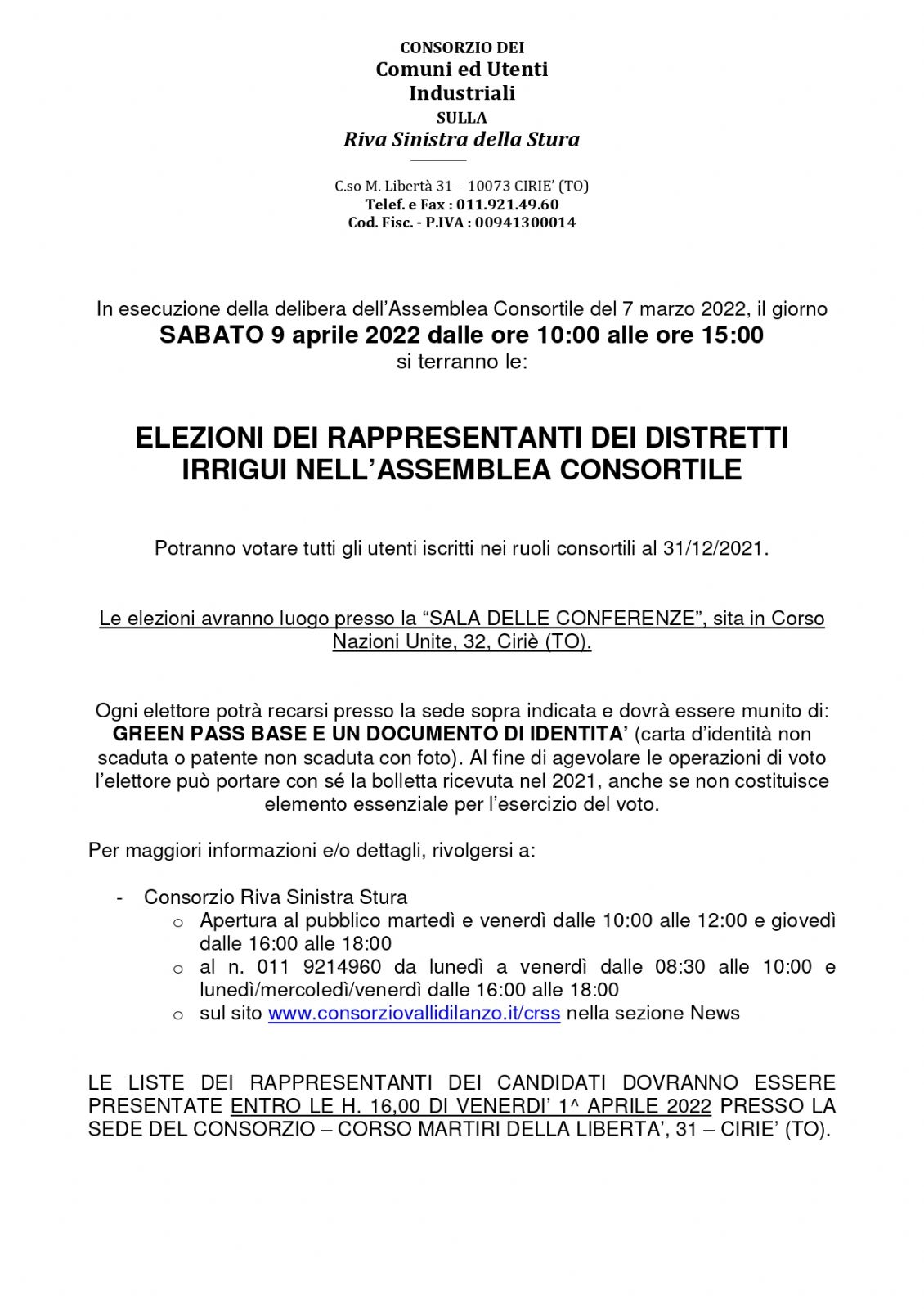 Il Consorzio Riva Sinistra Stura comunica che il 9 aprile dalle 10 alle 15, nella Sala delle Conferenze di corso Nazioni Unite 32 a Ciriè, si svolgeranno le elezioni dei rappresentanti dei distretti irrigui consortili.