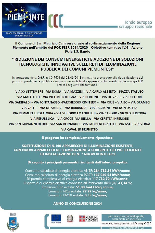 Riqualificazione dei propri impianti di Illuminazione Pubblica con installazione di apparecchi illuminanti con tecnologia LED con sostituzione di n. 190 apparecchi di illuminazione esistenti con nuovi apparecchi di illuminazione a sorgente LED più efficiente ed installazione di n. 7 nuovi punti luce. Il progetto, conclusosi nell'anno 2024, è stato realizzato grazie al co-finanziamento della Regione Piemonte nell’ambito del POR FESR 2014/2020 - Obiettivo tematico IV.4 – Azione IV.4c.1.3. – Bando ''Riduzione dei consumi energetici e adozione di soluzioni tecnologiche innovative sulle reti di illuminazione pubblica dei comuni Piemontesi‘’.